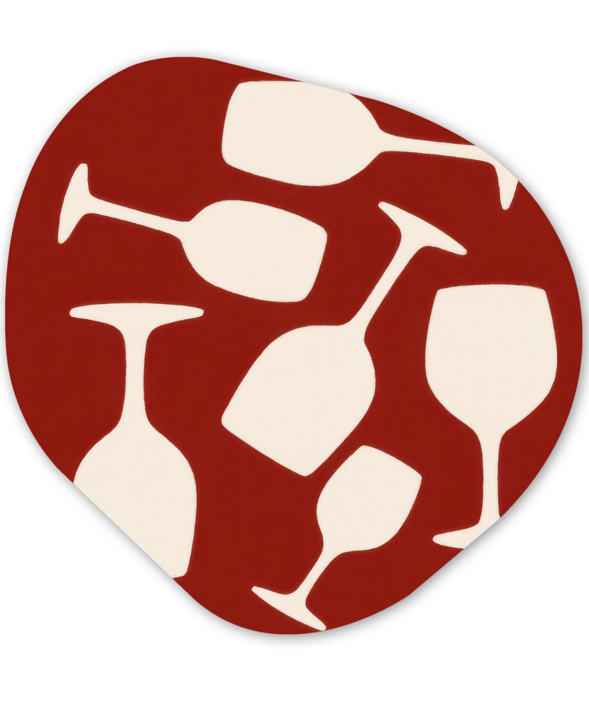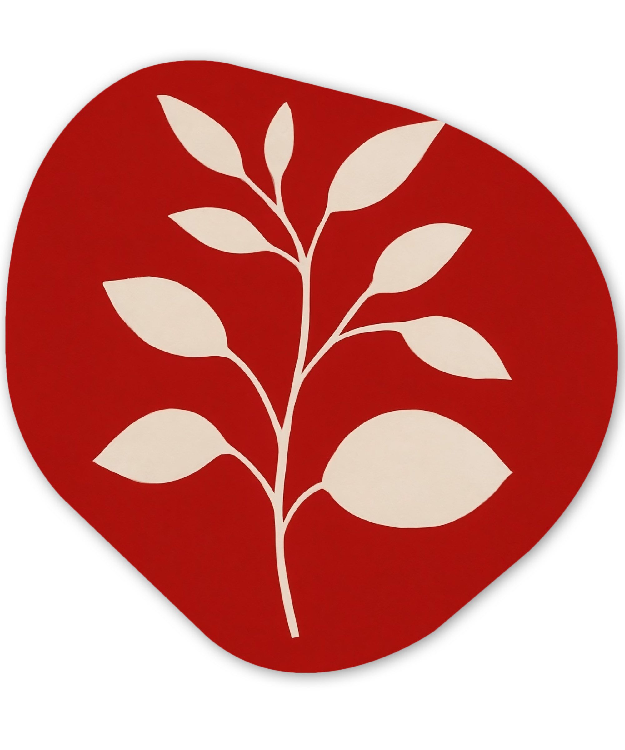 Eine schlichte weiße Silhouette eines Zweigs mit neun Blättern steht im Mittelpunkt des Geschehens auf einem tiefroten Hintergrund.Kunstgenre | Modern, Natur, Tiere, Abstrakt, Kinderzimmer |