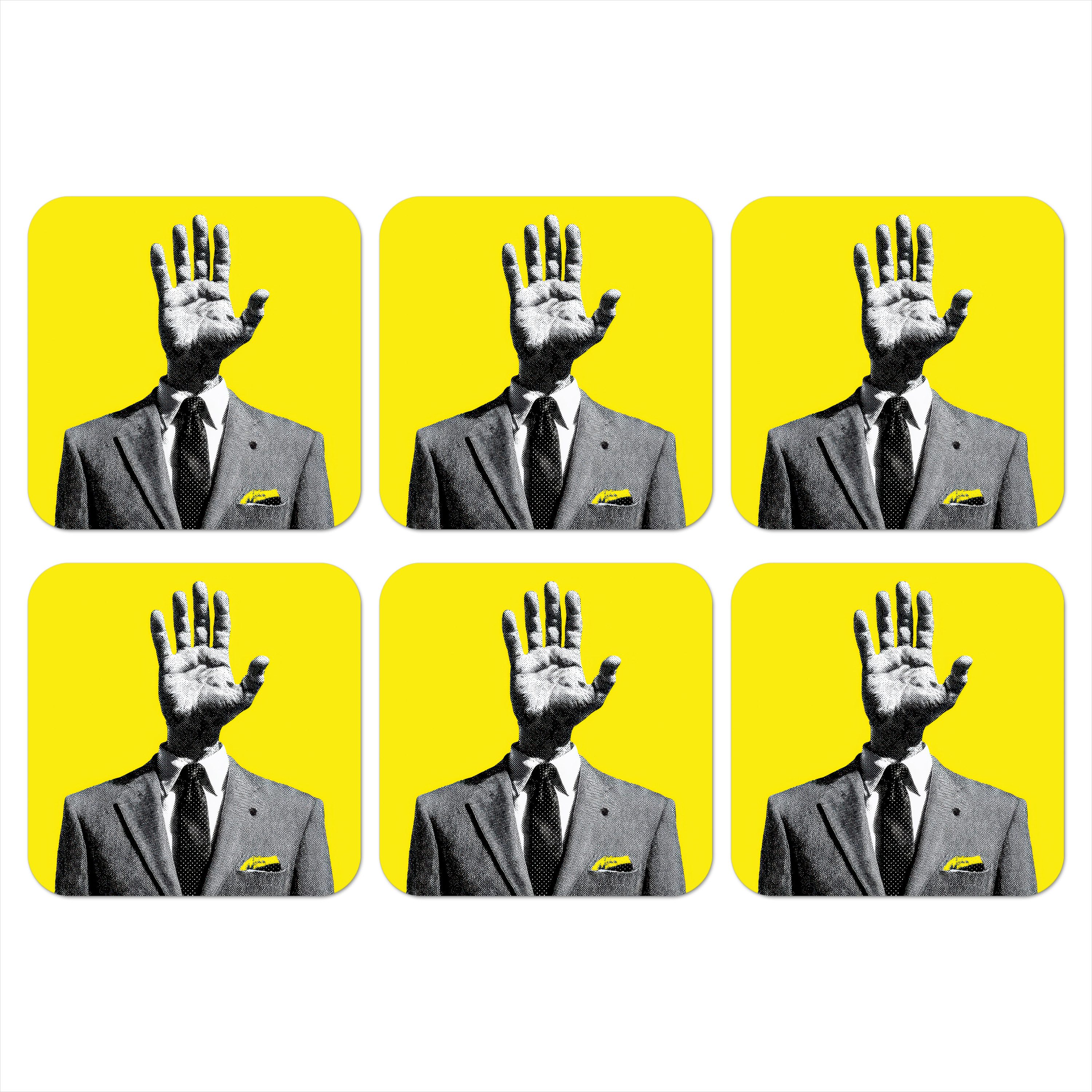 Digitale Collage einer Person in einem adretten Anzug, bei der der Kopf durch eine erhobene Hand ersetzt ist. Das Bild ist in Schwarz-Weiß mit Punktstruktur vor einem leuchtend gelben Hintergrund gehalten, was einen starken Kontrast und eine absurde Atmosphäre schafft.