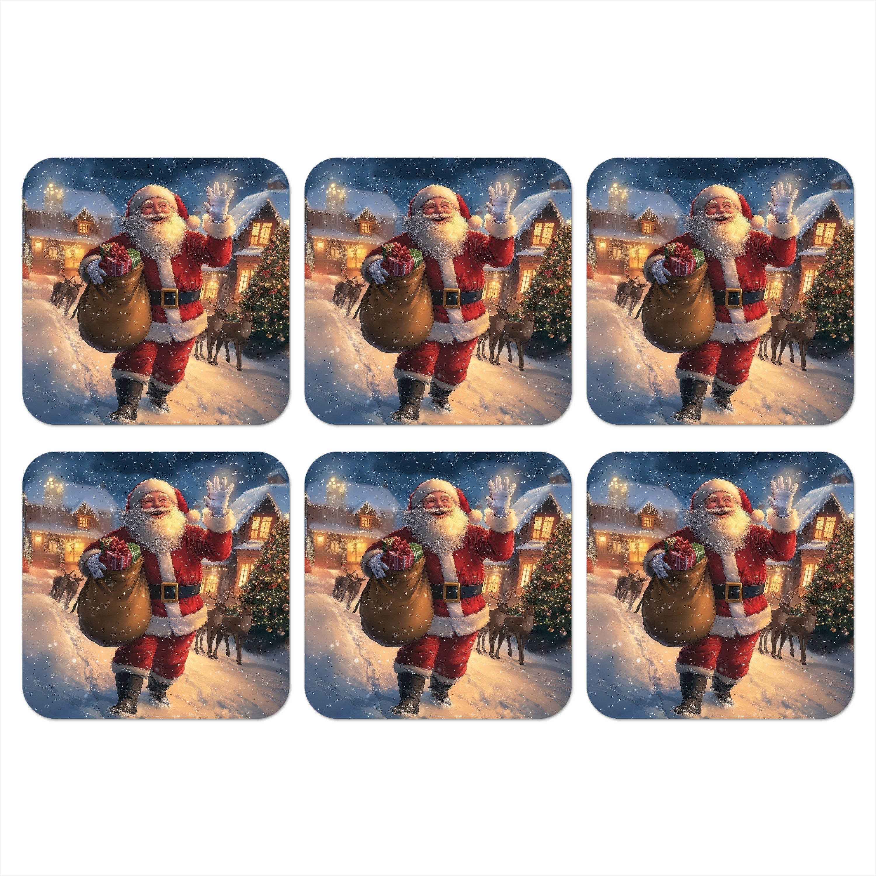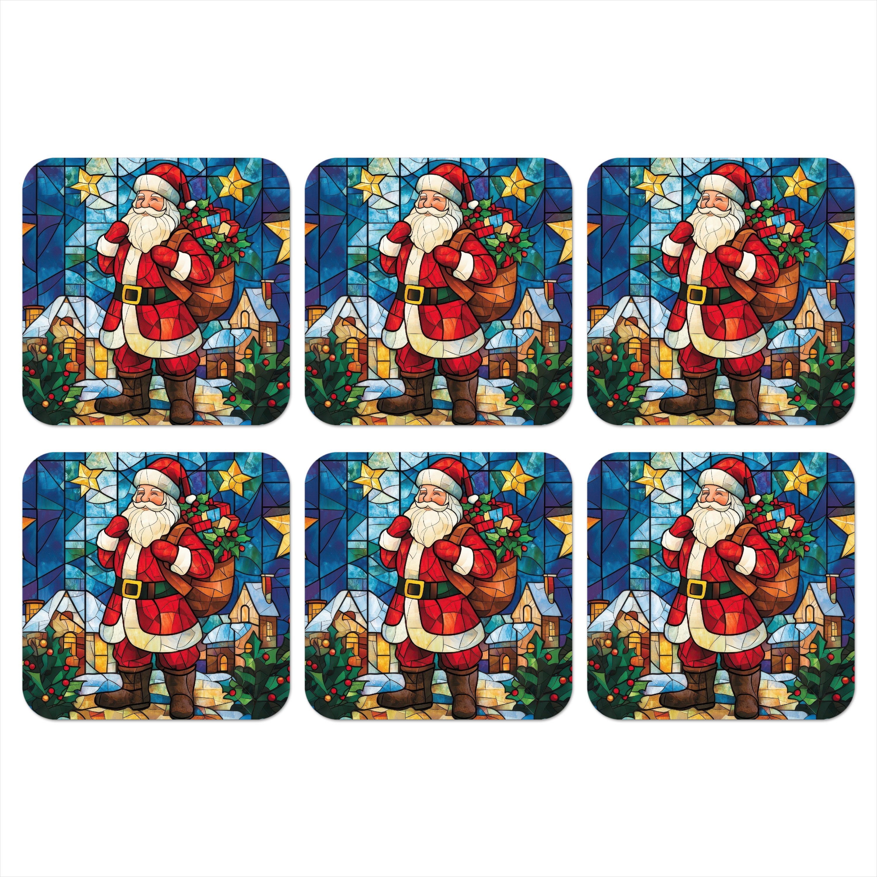 Ein farbenfrohes Buntglasfenster zeigt den Weihnachtsmann mit einem vollen Sack voller Geschenke und Stechpalmenzweigen. Er steht lächelnd zwischen schneebedeckten Häusern, während große goldene Sterne vor dem blauen Nachthimmel funkeln. Darunter vervollständigen grüne Stechpalmenblätter mit roten Beeren die festliche Komposition.