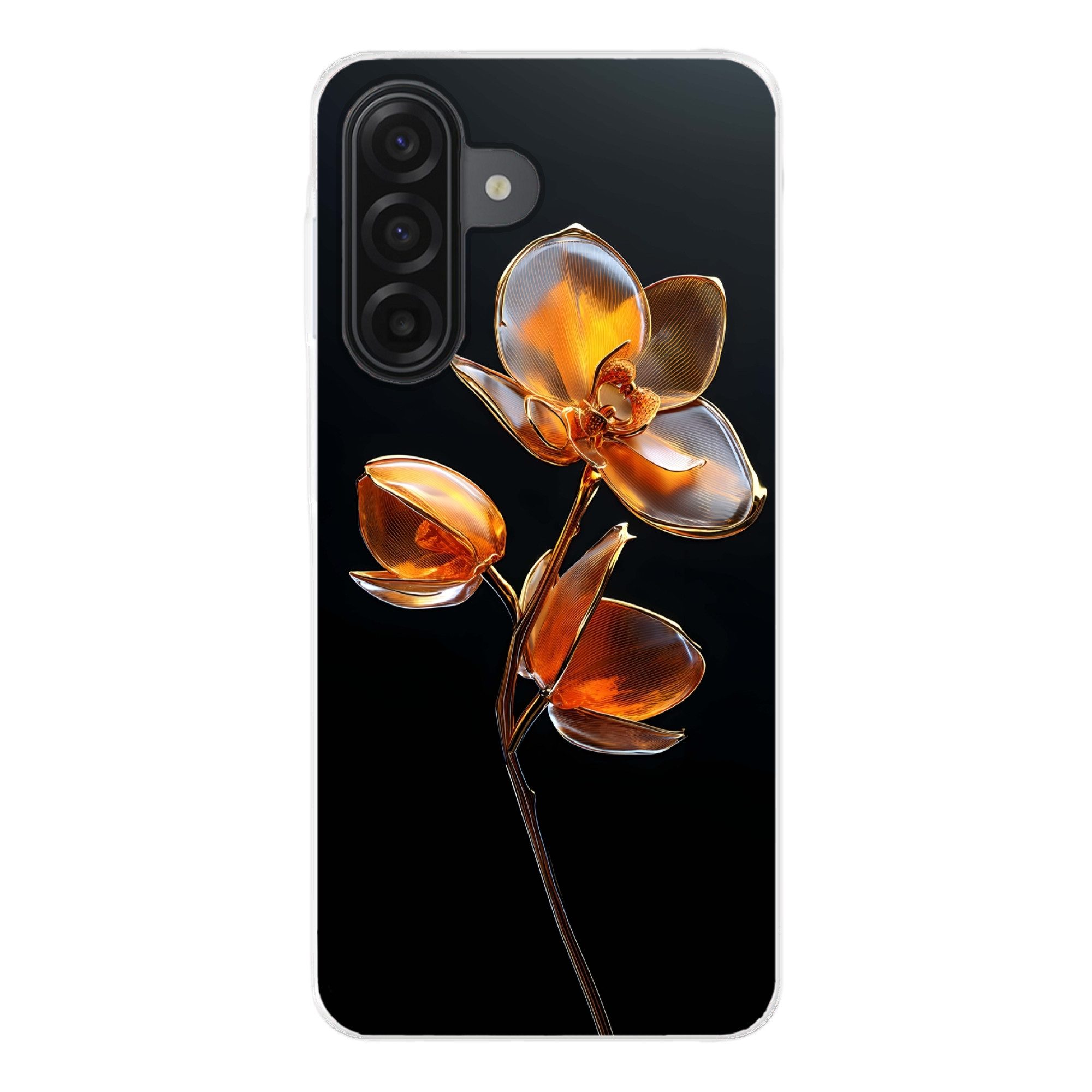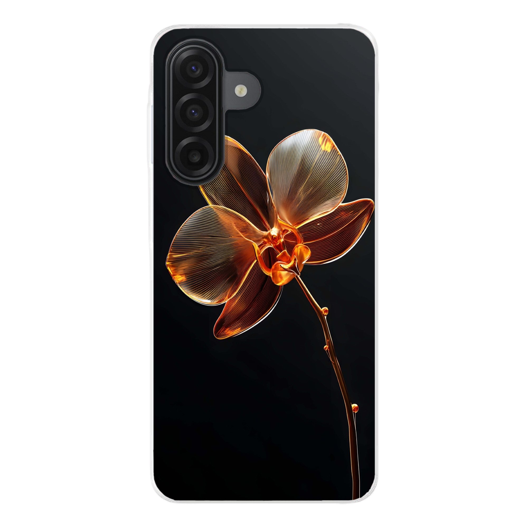 Eine Orchidee mit warmen, bernsteinfarbenen, transparenten Blütenblättern und zarten Adern auf schwarzem Hintergrund.