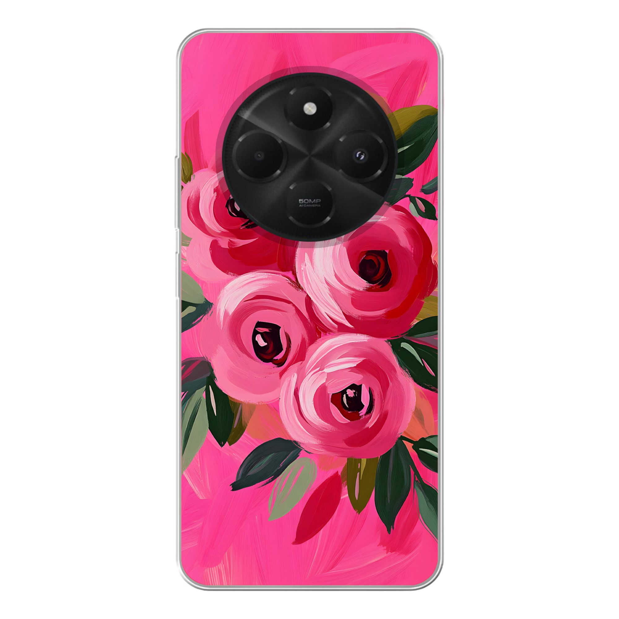 Ein stilisierter Strauß rosa Rosen mit tiefgrünen Blättern auf einem leuchtend rosa Hintergrund. Die Pinselstriche sind fließend und die Komposition strahlt Fröhlichkeit aus.