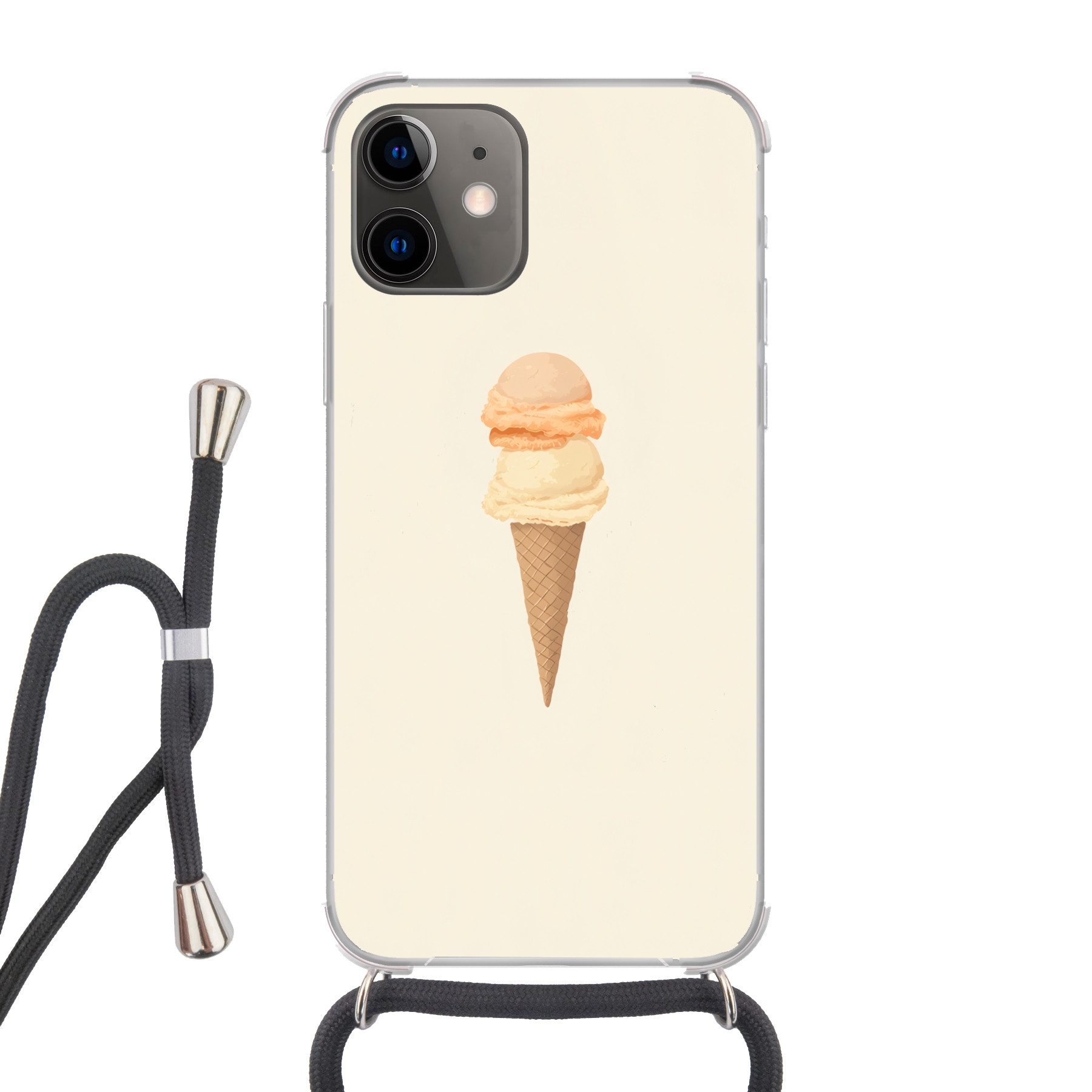 Zwei Kugeln Eiscreme, oben hellorange und unten cremige Vanille, präsentiert in einer Waffel vor einem beigen Hintergrund. Die sanften Pastellfarben verleihen ihm einen nostalgischen Touch.