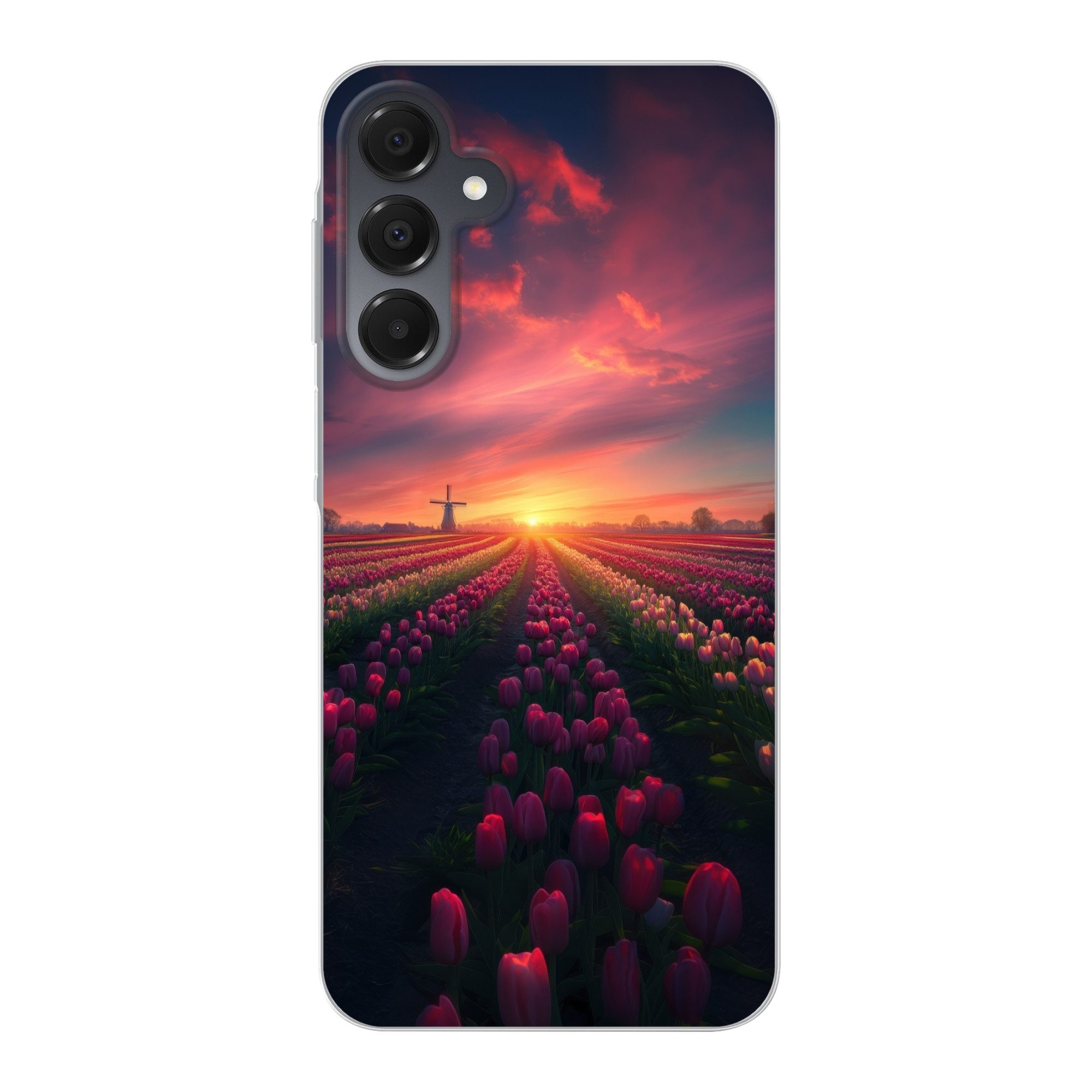 Ein wunderschönes Tulpenfeld in verschiedenen Farben erstreckt sich unter einem warmen Sonnenuntergang. In der Ferne steht eine traditionelle Windmühle, die der Landschaft einen typisch niederländischen Charakter verleiht.