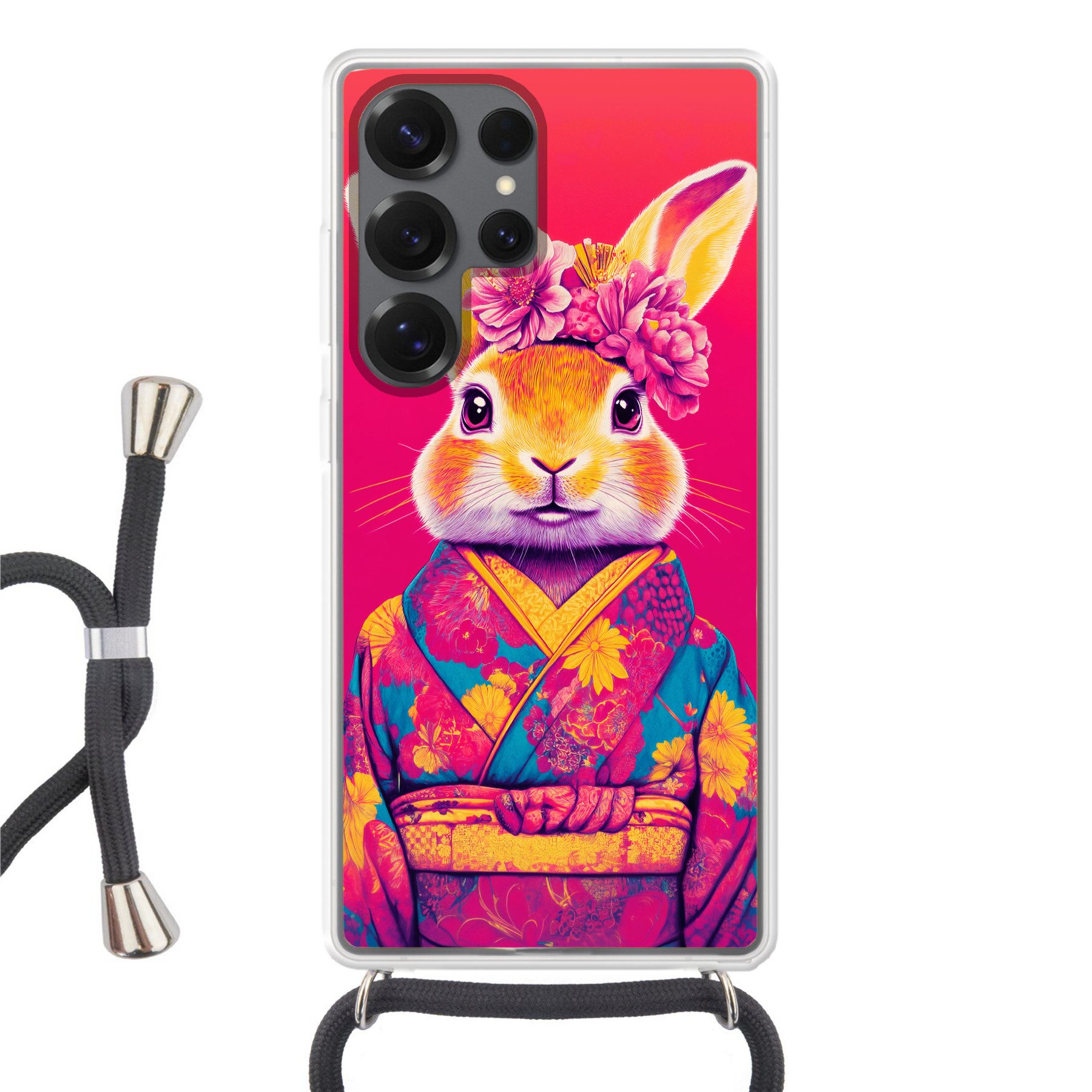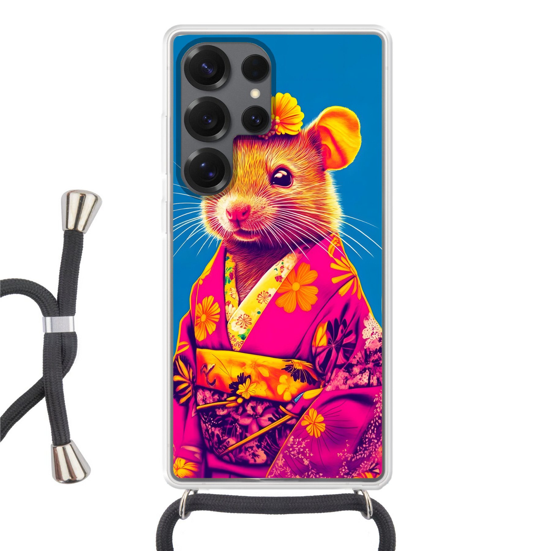 Eine orangefarbene Katze schaut mit großen Augen auf, gekleidet in einen rosa Kimono mit gelben Blumen und einem rosa Hintergrund.