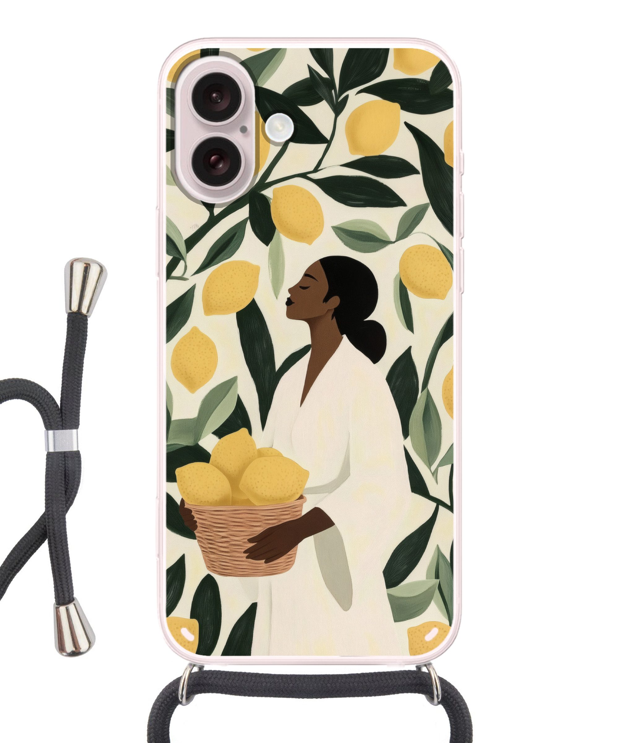 Eine Frau in einem weißen Kleid trägt einen Korb voller Zitronen, umgeben von einem Muster aus grünen Blättern und gelben Früchten.