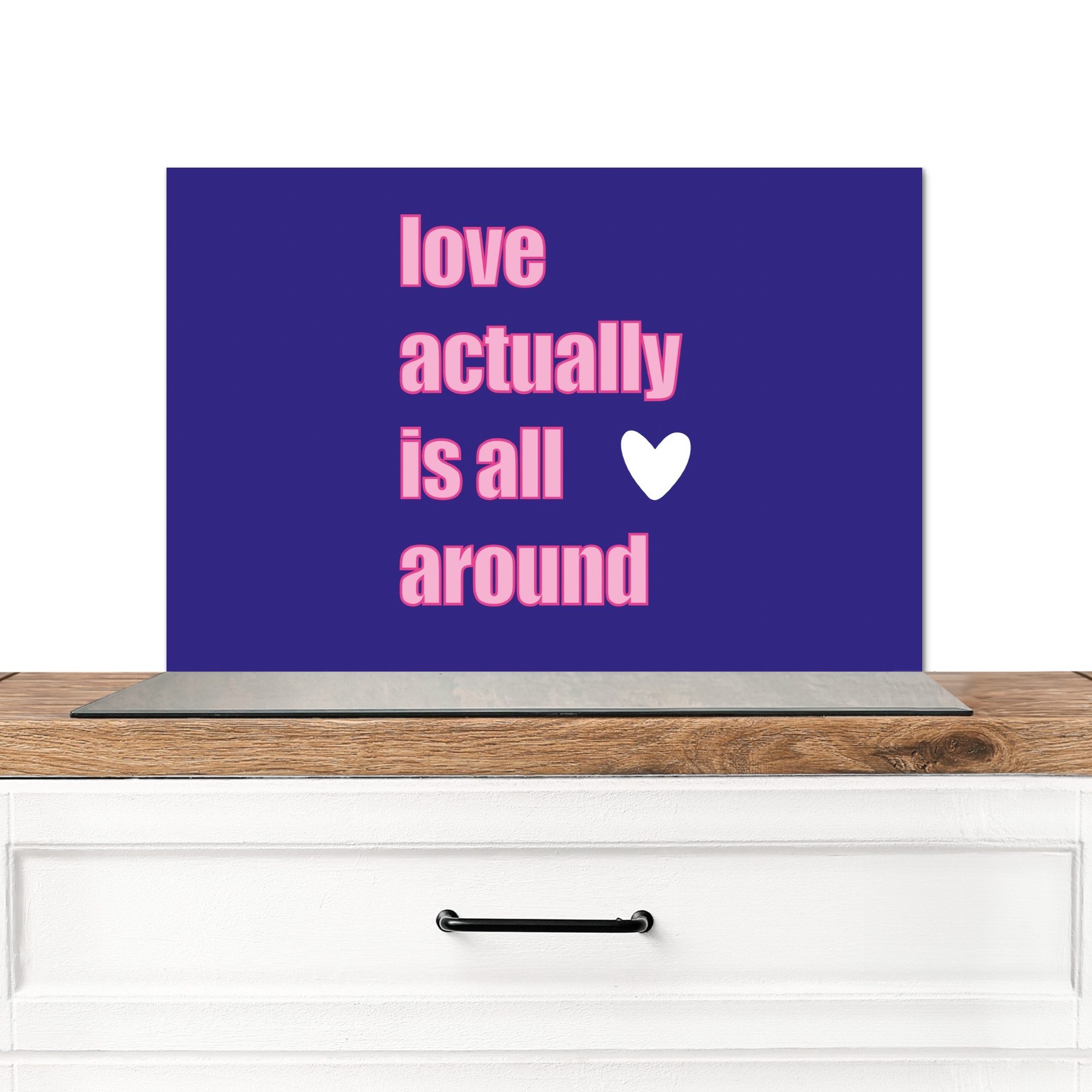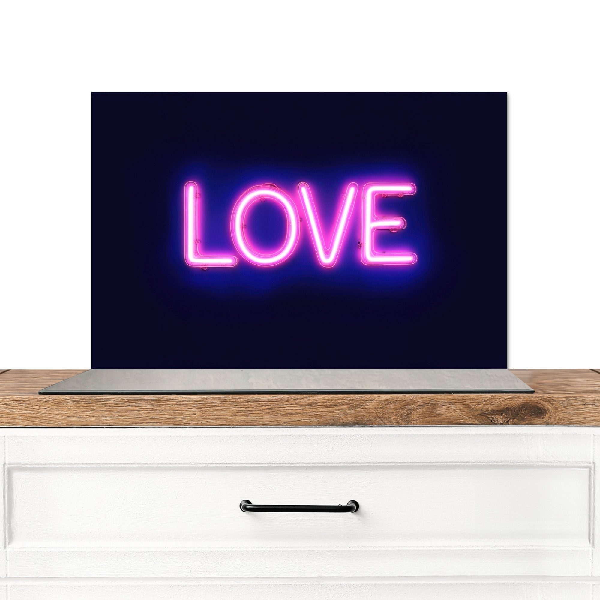 Das Wort "LOVE" in leuchtend pinken Neonbuchstaben, umrahmt von einem sanften Leuchten, vor einem tiefdunklen blauen Hintergrund. Das minimalistische Design strahlt Wärme und Leidenschaft mit einem modernen und urbanen Gefühl aus.