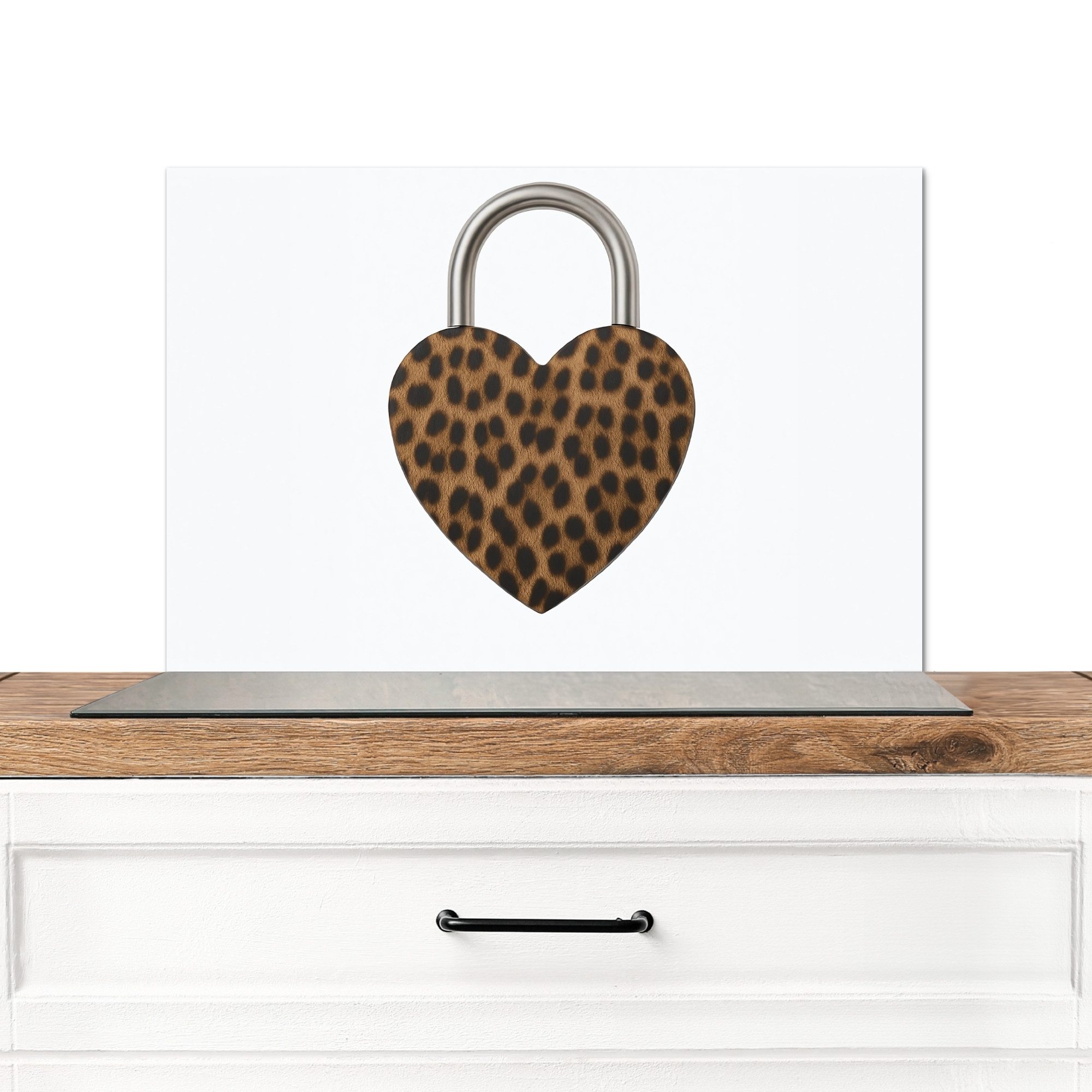 Ein herzförmiges Vorhängeschloss mit Pantherdruck und einem Metallbügel schwebt vor einem weißen Hintergrund.