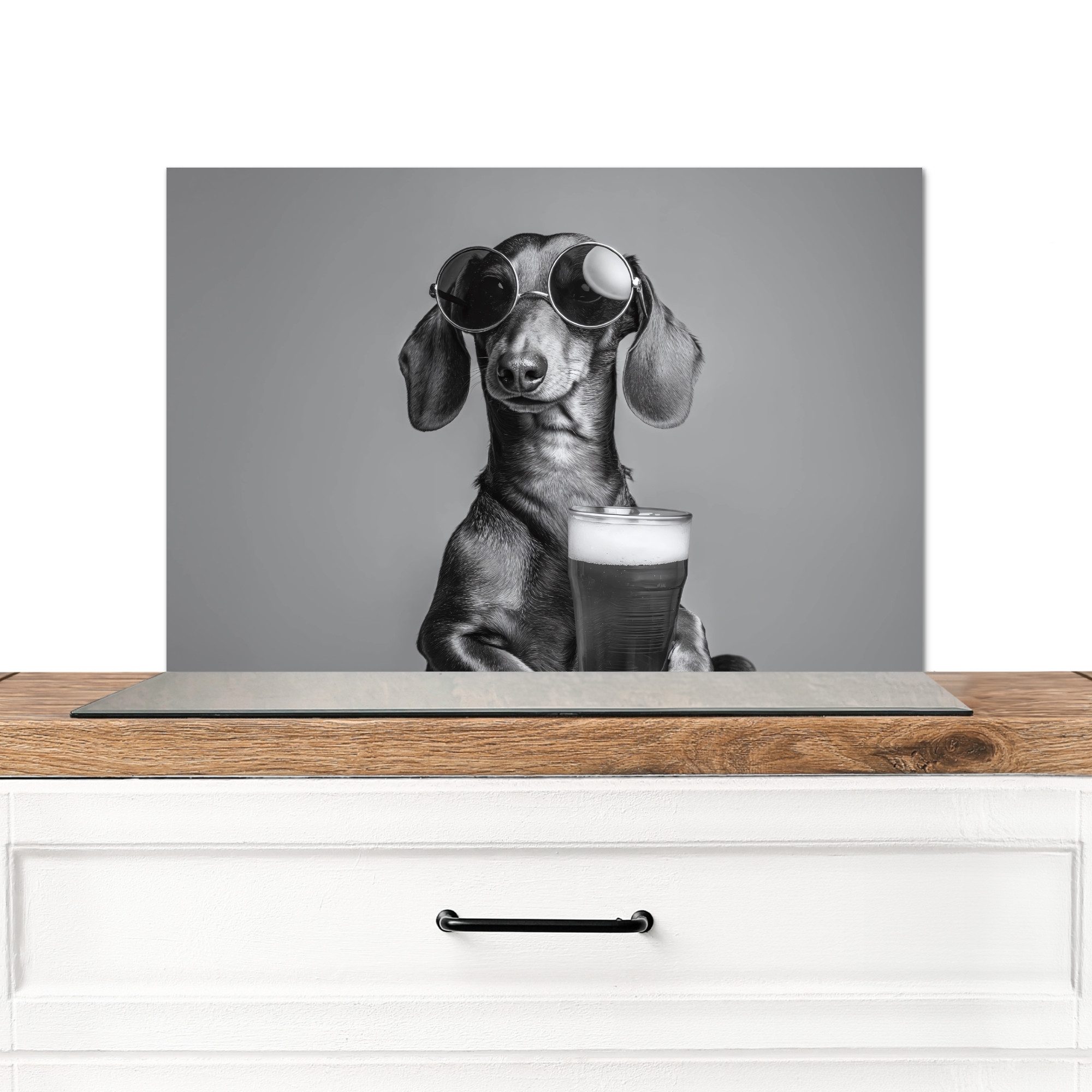 Ein Dackel mit runder Brille blickt ruhig vor sich hin, während er ein Glas Bier hält.