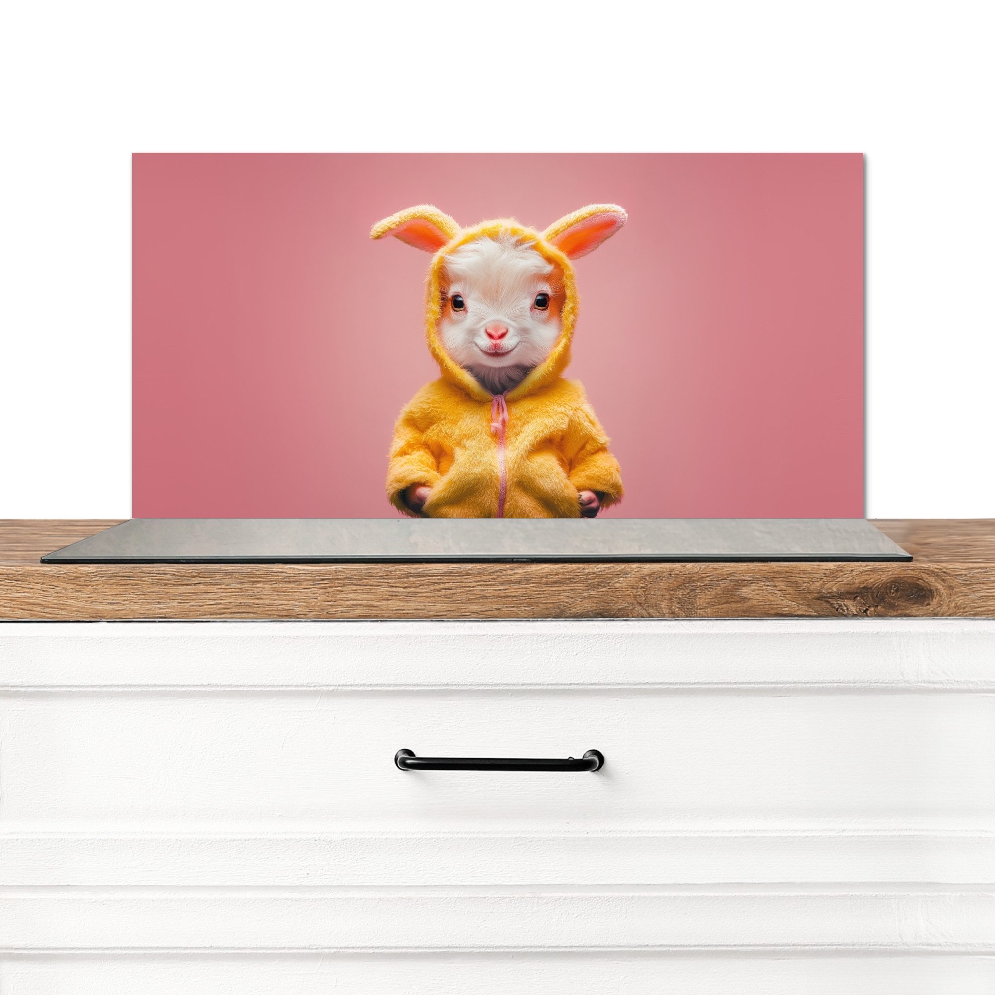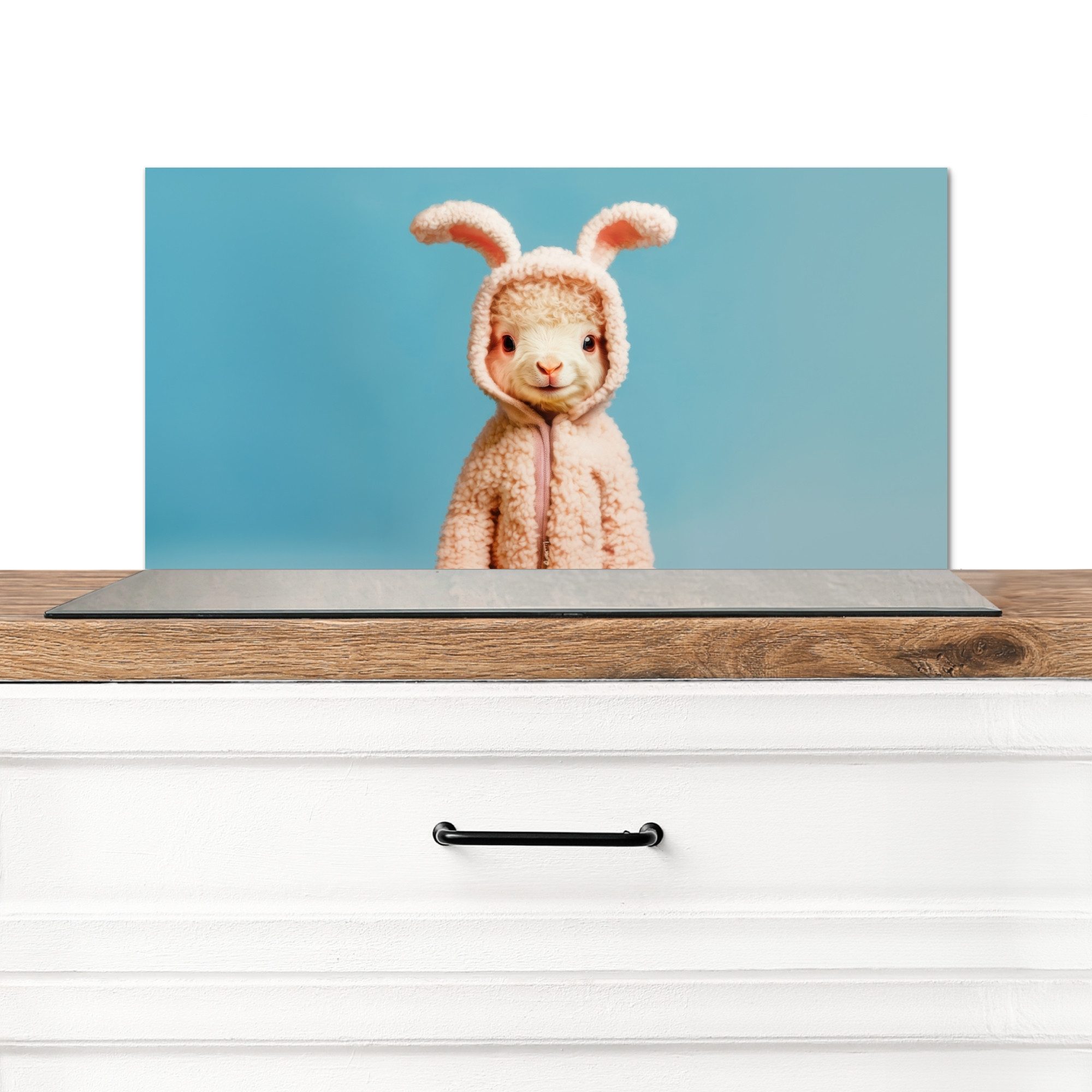 Ein süßes kleines Lamm trägt ein flauschiges rosa Osterhasen-Outfit mit langen Ohren. Das Tier blickt freundlich in die Kamera vor einem hellblauen Hintergrund, der eine fröhliche und verspielte Atmosphäre schafft.