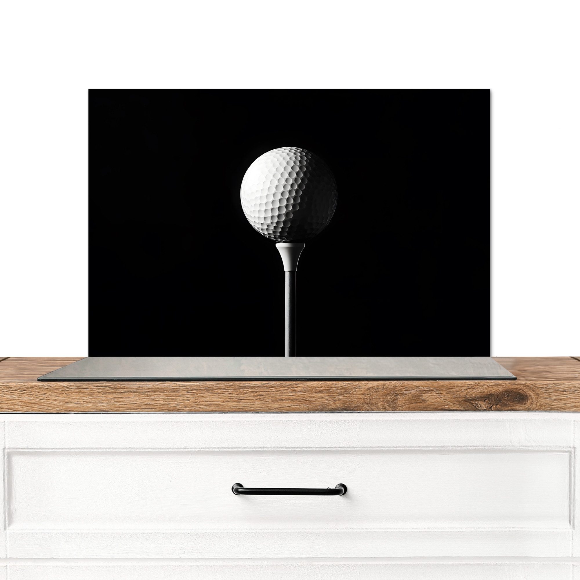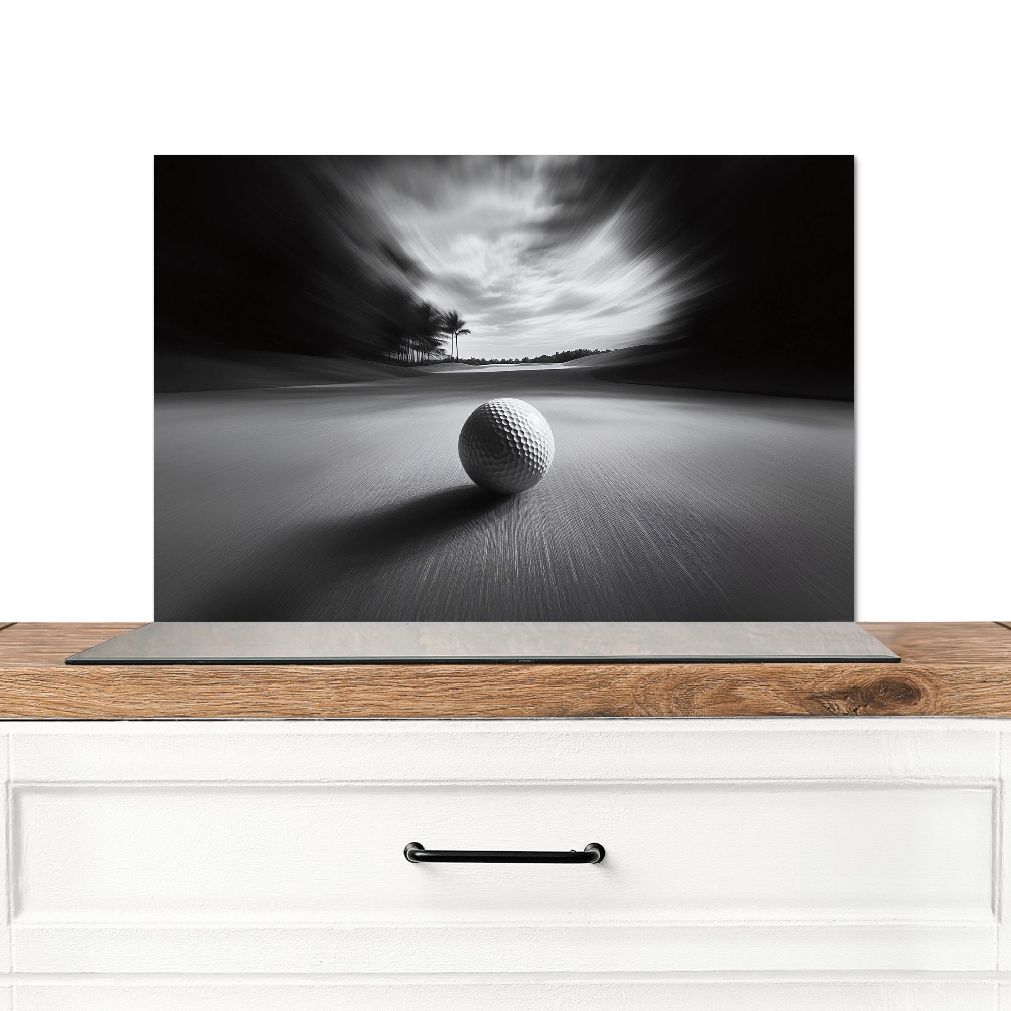 Ein weißer Golfball liegt auf einem Platz mit Bewegungsunschärfe im Hintergrund und einer dramatischen Schwarz-Weiß-Atmosphäre.
