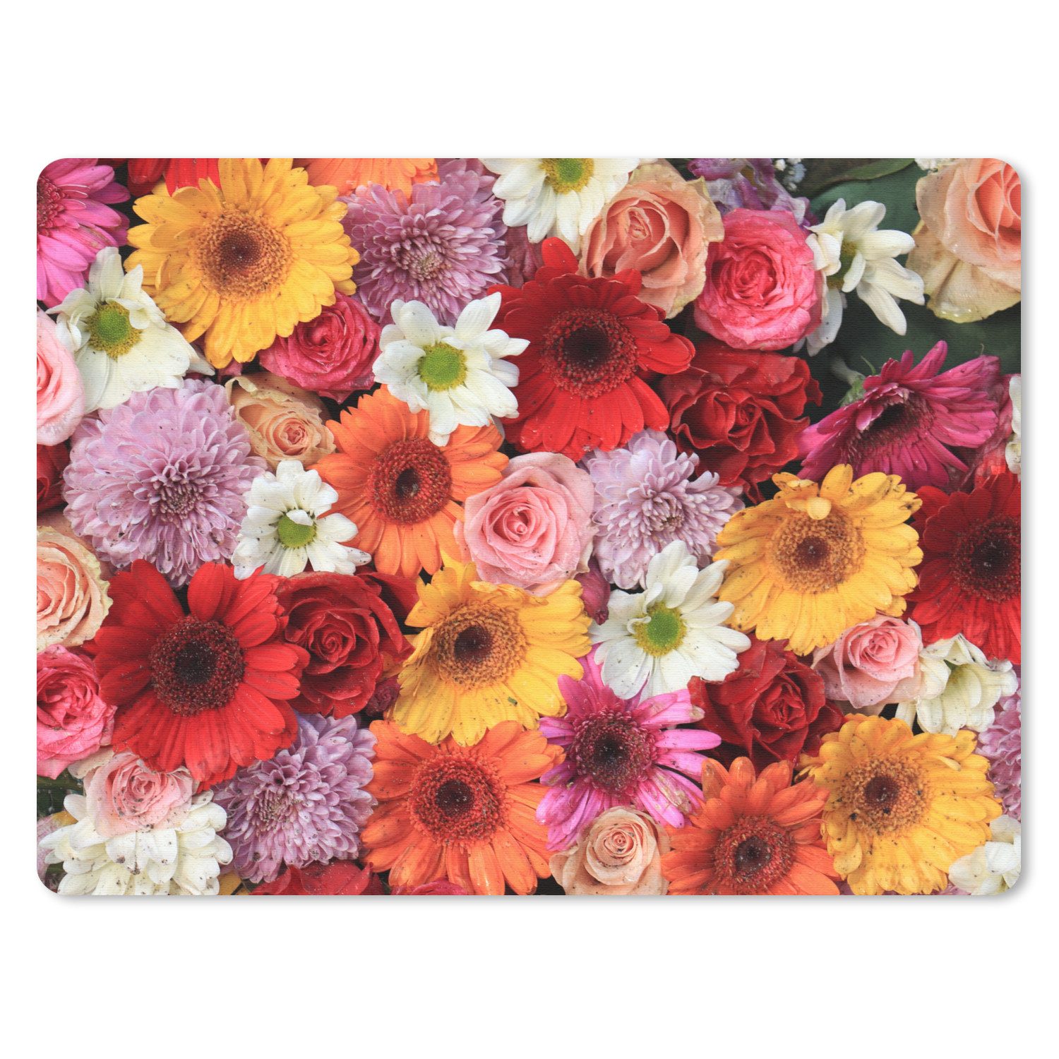 На повний екран-Collage von Blumen, darunter Rosen und Gerbera aus der Natur. Die Blüten haben unterschiedliche Farben.
