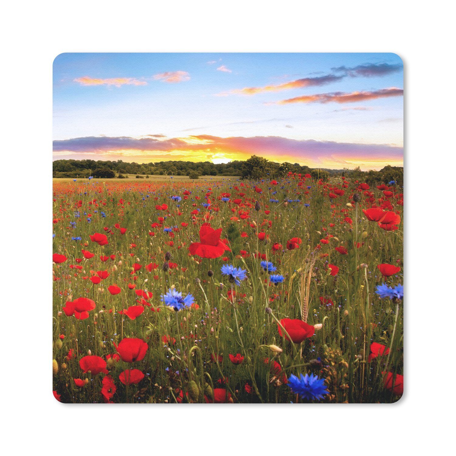 Eine Blumenwiese mit roten und blauen Mohnblumen während eines Sonnenuntergangs.