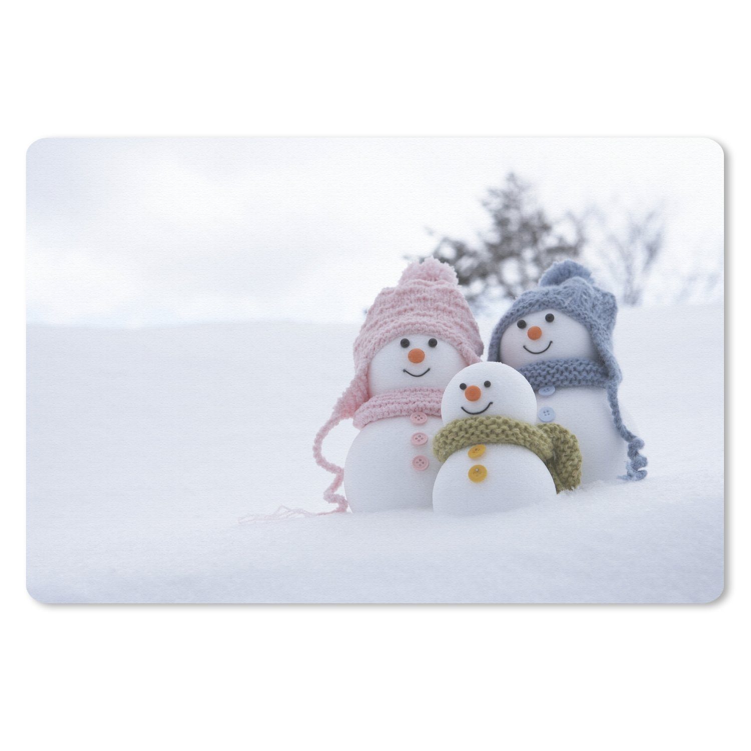 Ein atemberaubendes Foto einer Familie von Weihnachtspuppen auf der verschneiten Landschaft, mit einem bedeckten Himmel im Hintergrund.