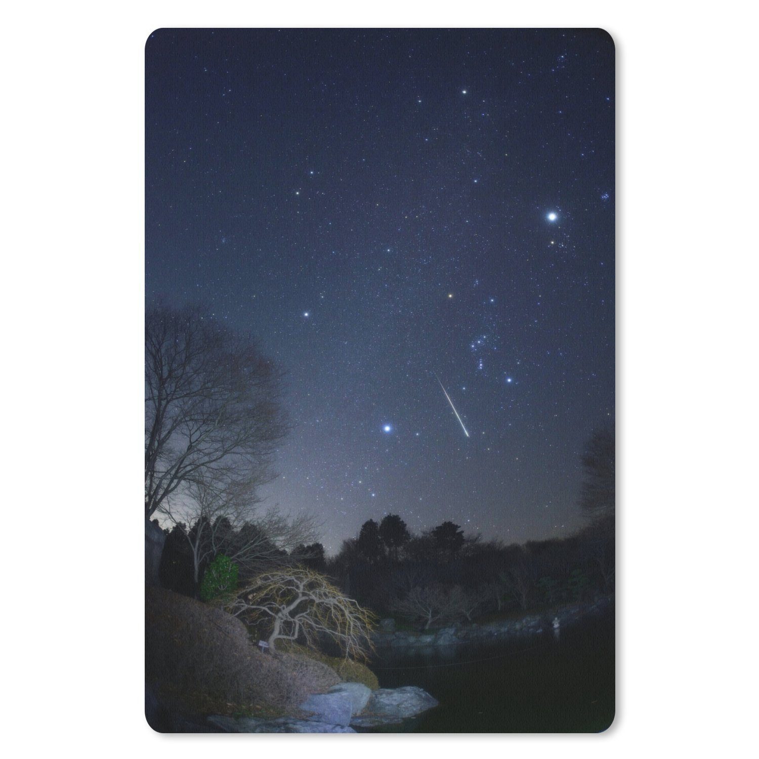 Eine Sternschnuppe über der friedlichen japanischen Landschaft. Die Tiefe des Universums ist fast greifbar. Die Natur ist wegen der dunklen Nacht weniger sichtbar.