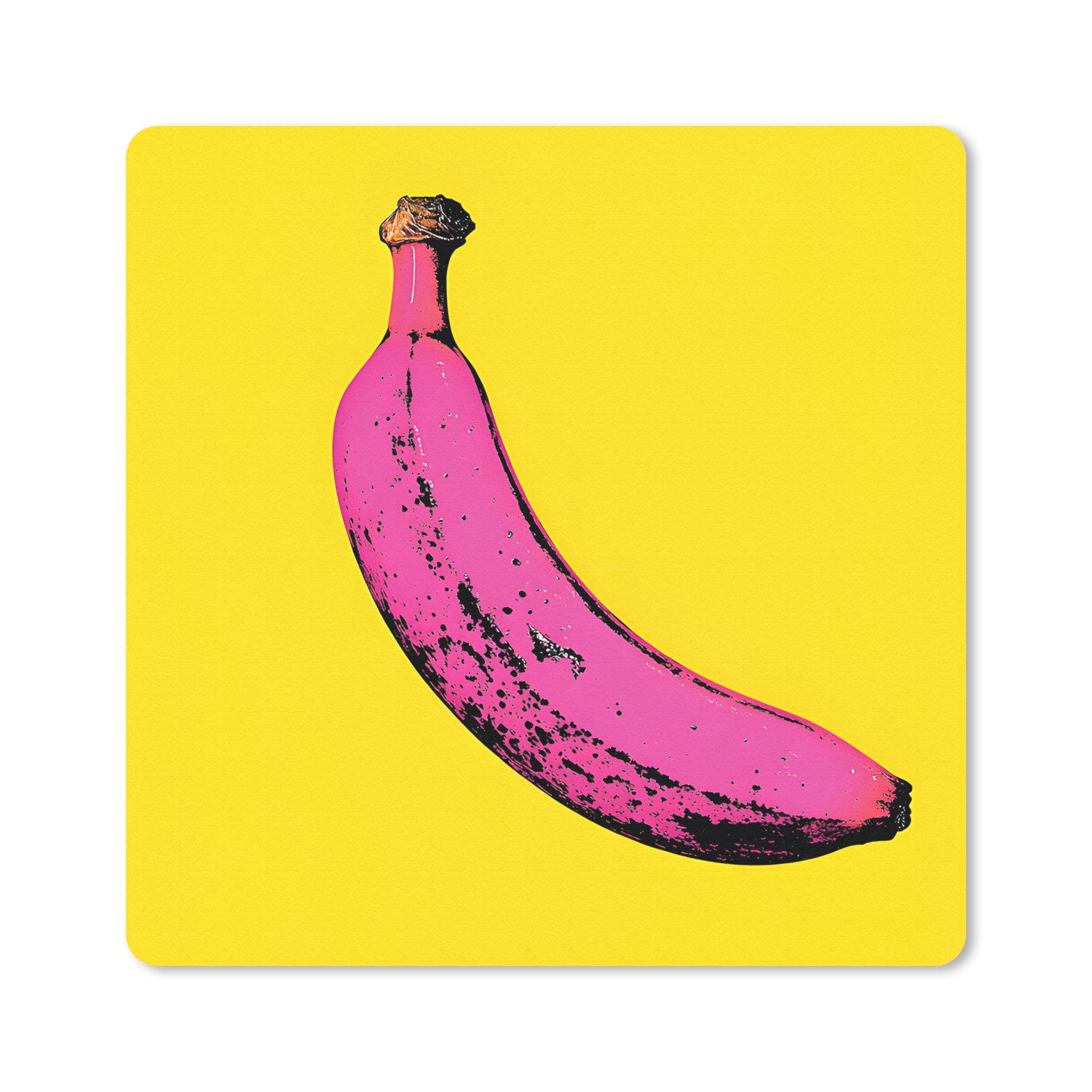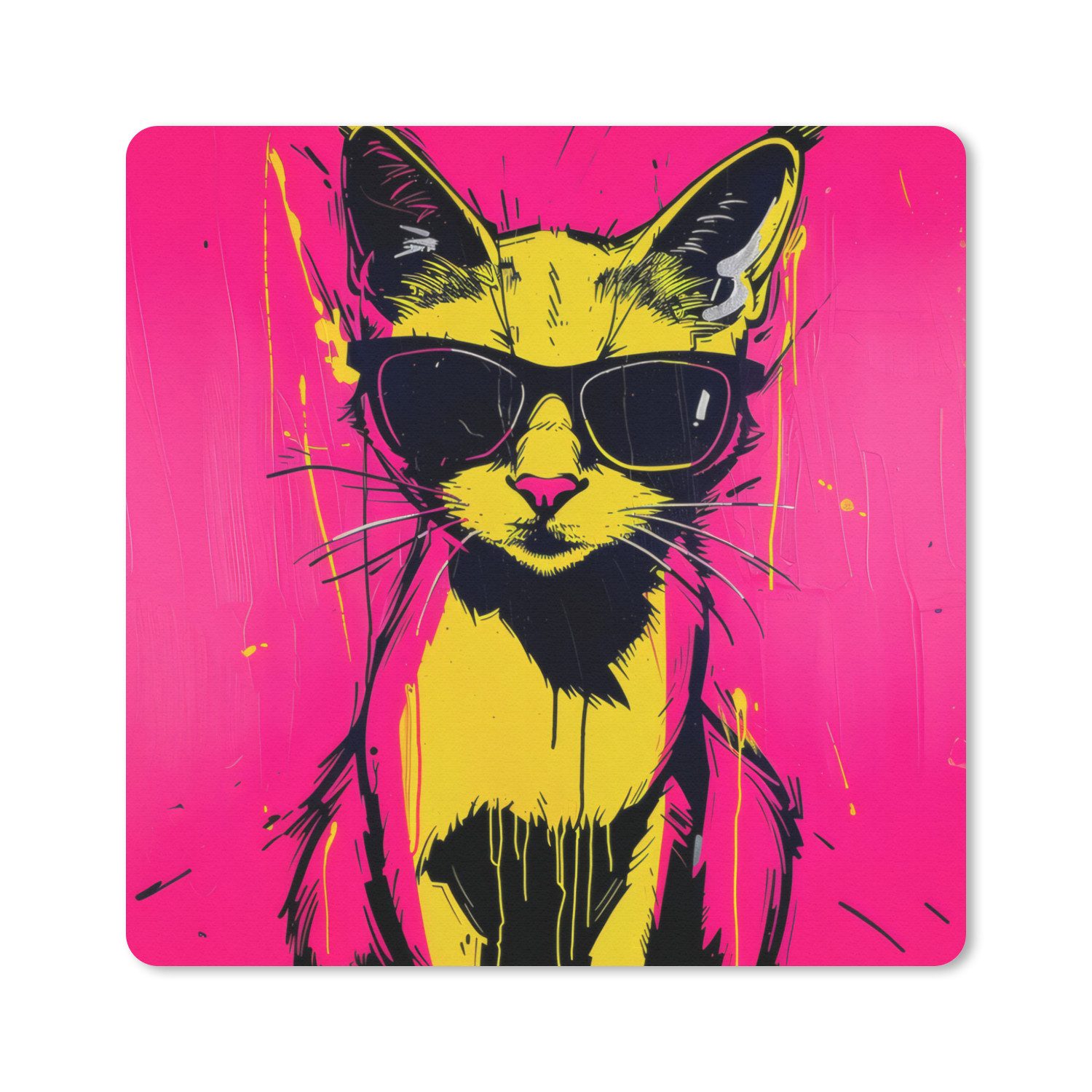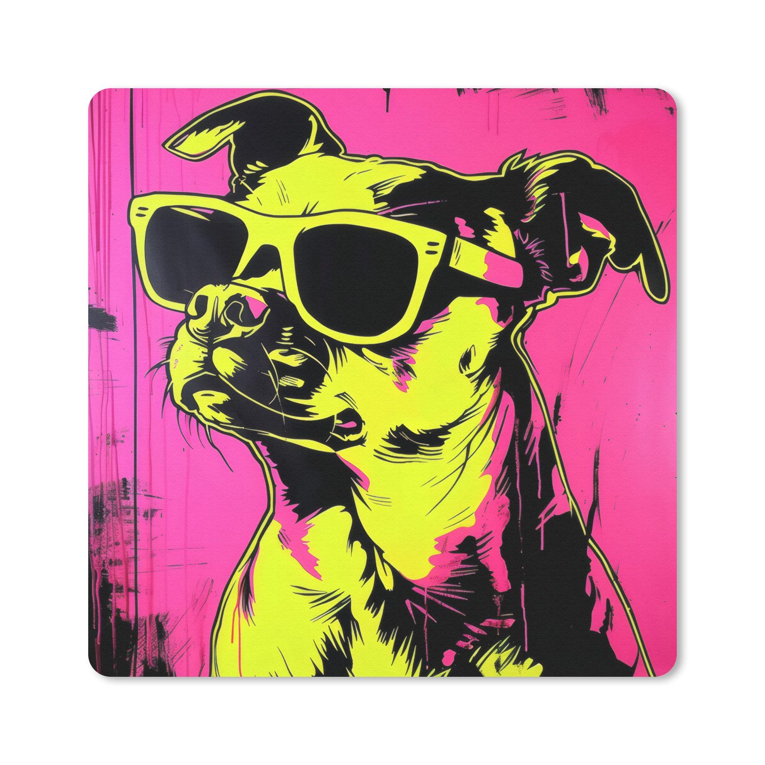 Ein Hund mit leuchtend gelbem Fell trägt eine große Sonnenbrille. Der Hintergrund ist leuchtend rosa mit schwarzen Sprenkeln.