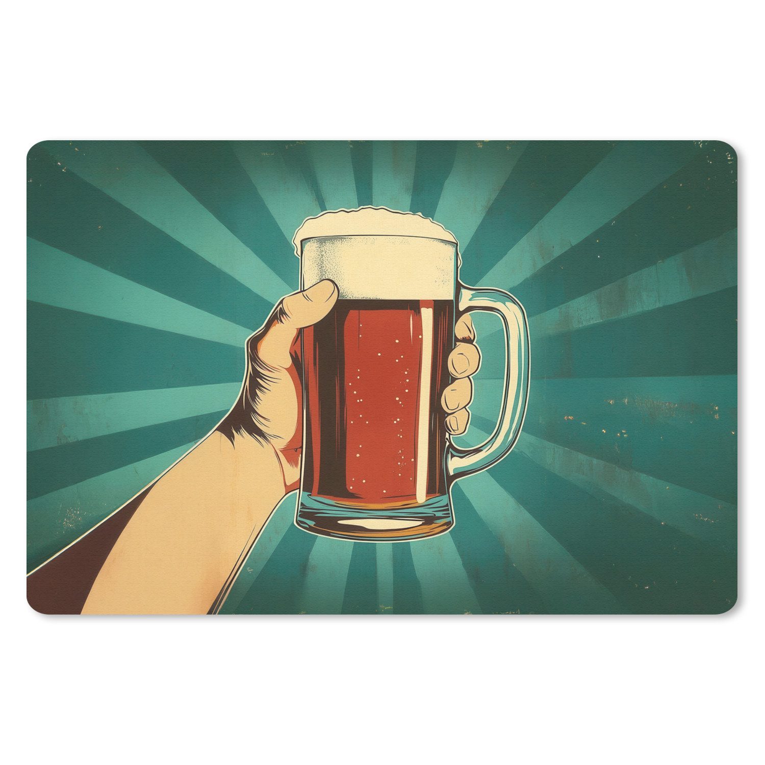 Eine Hand hält einen schäumenden Bierkrug vor einem Hintergrund aus blaugrünen Strahlen hoch, der eine festliche Retro-Atmosphäre hervorruft.