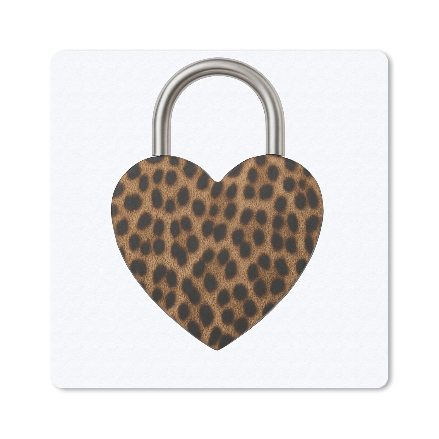 Ein herzförmiges Vorhängeschloss mit Pantherdruck und einem Metallbügel schwebt vor einem weißen Hintergrund.