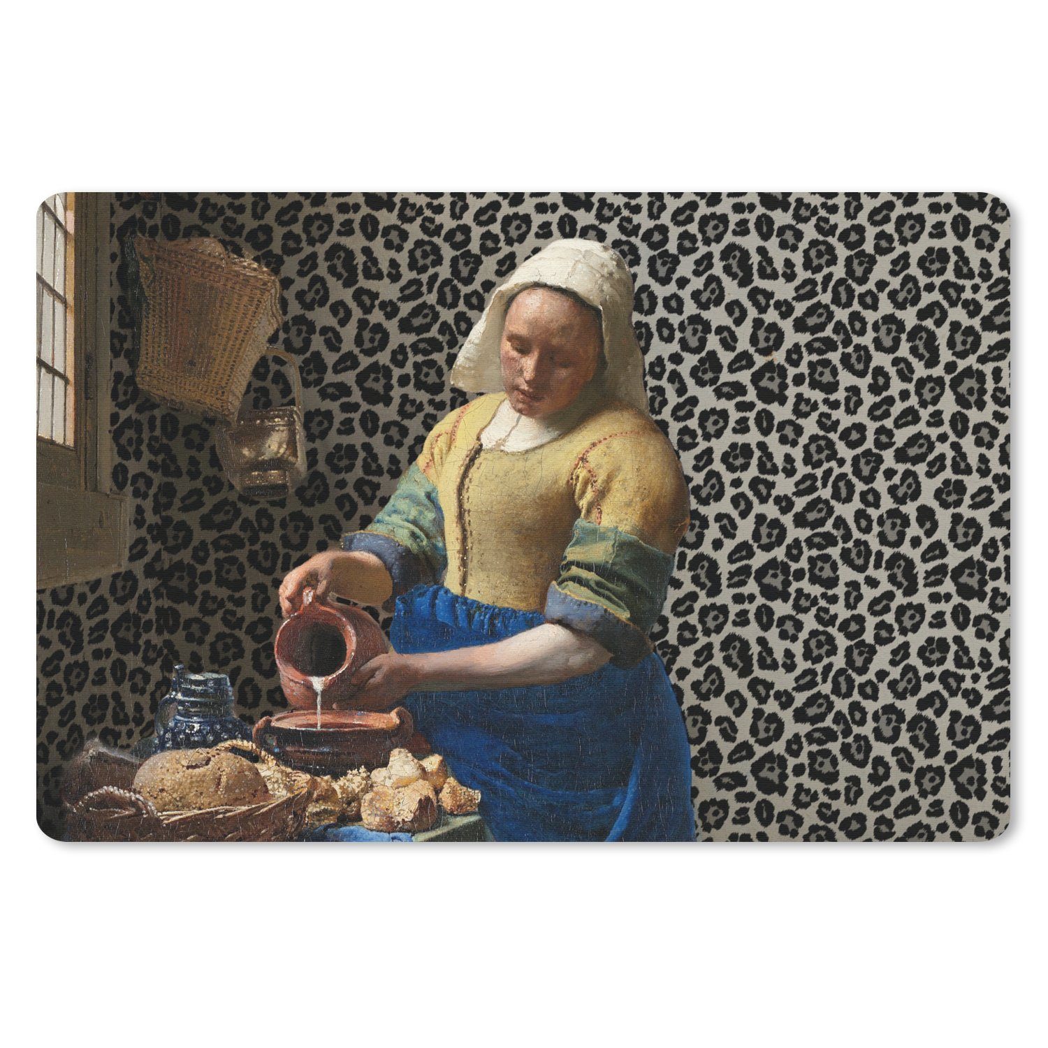 Das Milchmädchen von Vermeer mit einem Pantherdruck im Hintergrund.