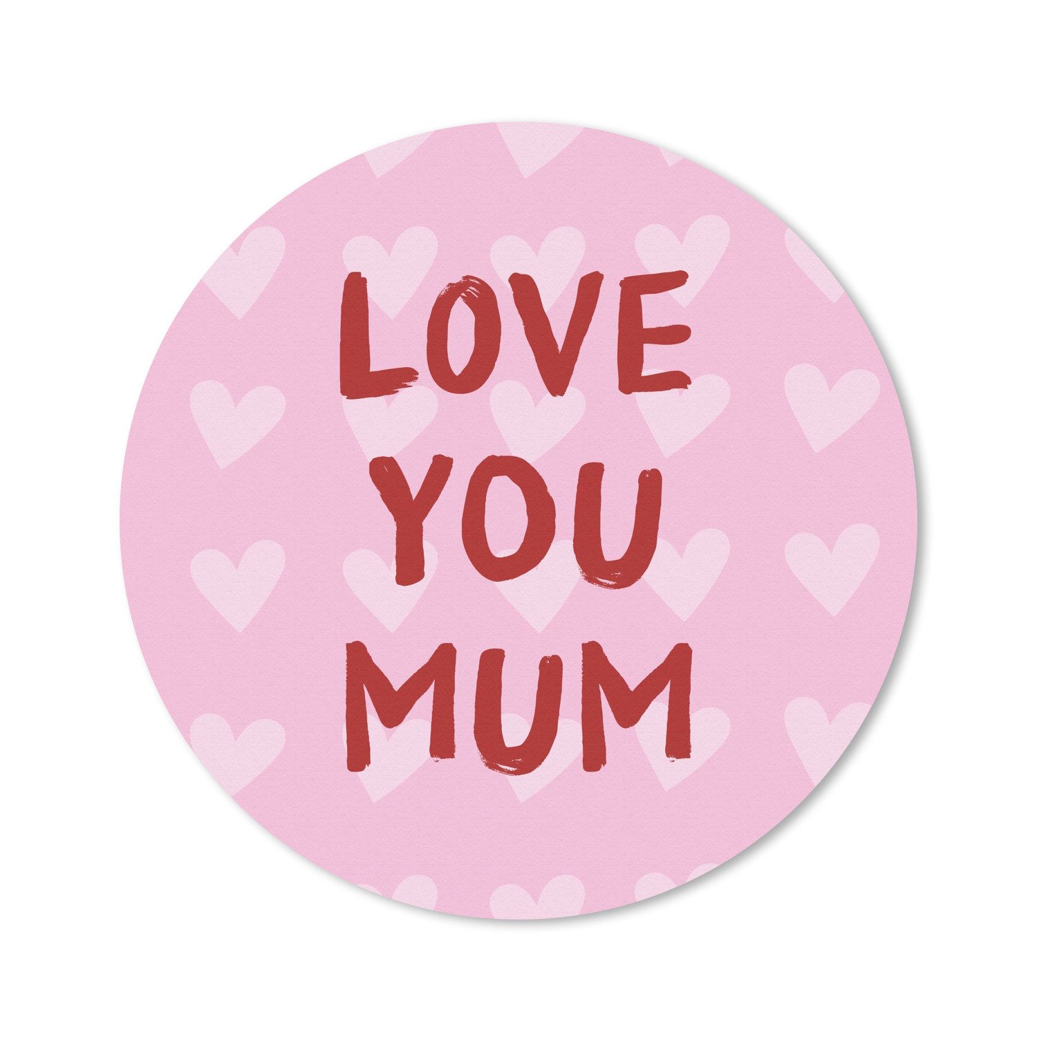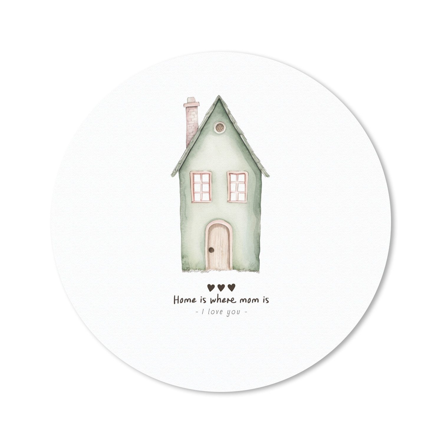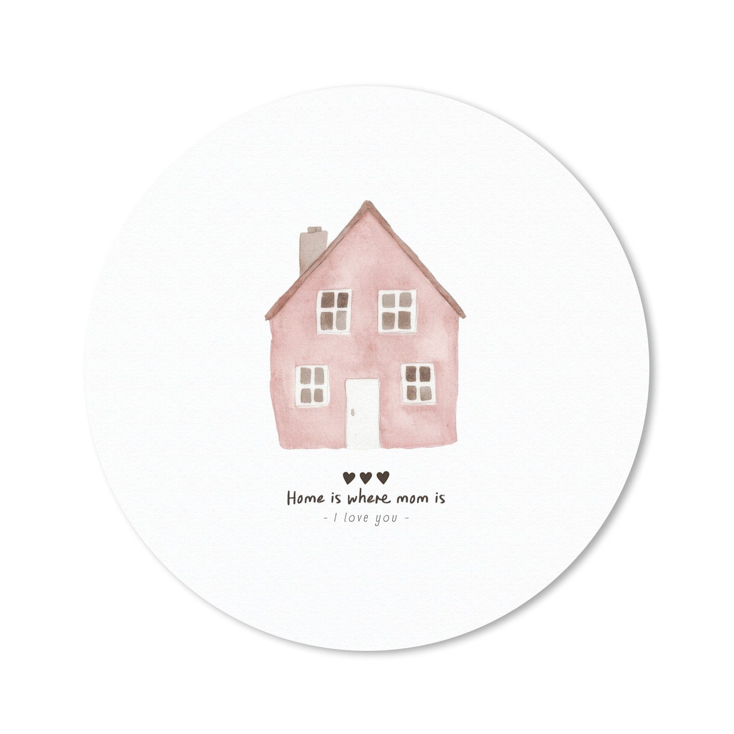 Ein rosa Haus mit Herzen darüber und dem Text "Home is where mom is - I love you" darunter.