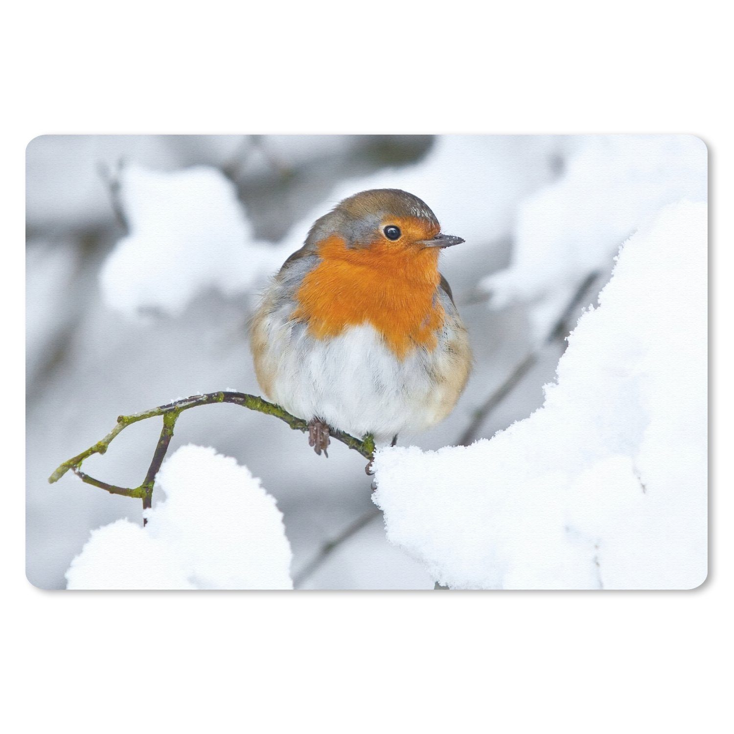 Ein Rotkehlchen ruht sich auf einem verschneiten Ast aus.