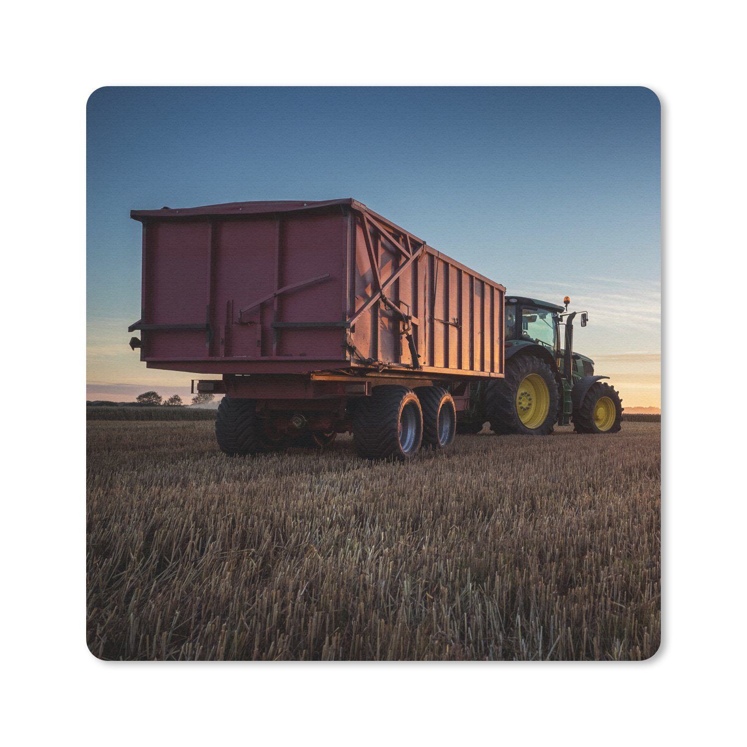 Sie brauchen eine weitere Unterlage für Ihren Schreibtisch? Dann ist dieses Mauspad genau das Richtige für Sie! Diese Mausunterlage hat ein Bild von einem grünen Traktor mit gelben Rädern fahren während eines Sonnenuntergangs auf dem Land. Der Traktor hat einen roten Anhänger.