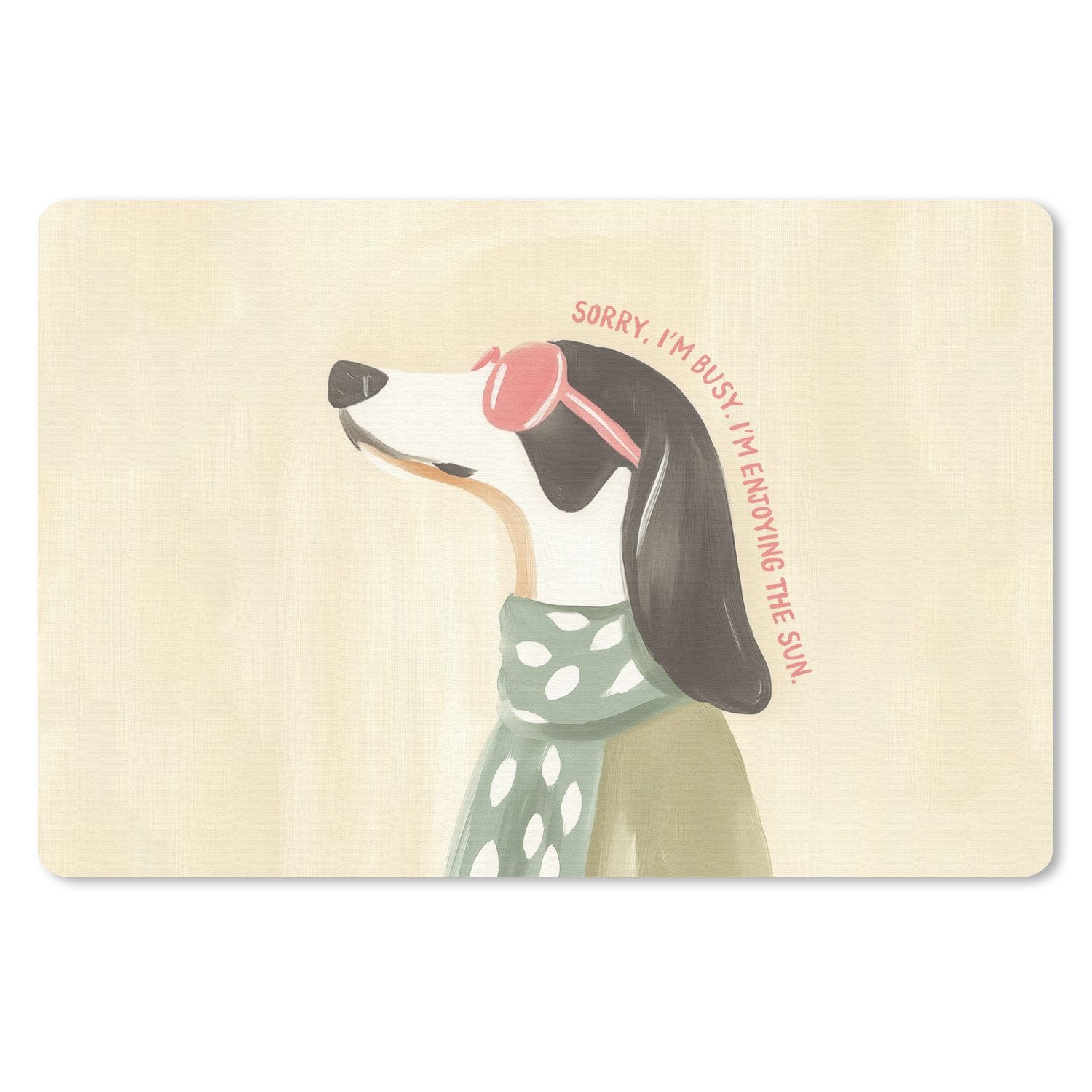 Ein Hund mit rosa Sonnenbrille und grünem Schal blickt vor einem beigen Hintergrund mit dem Text "Sorry, I'm busy. Ich genieße die Sonne."