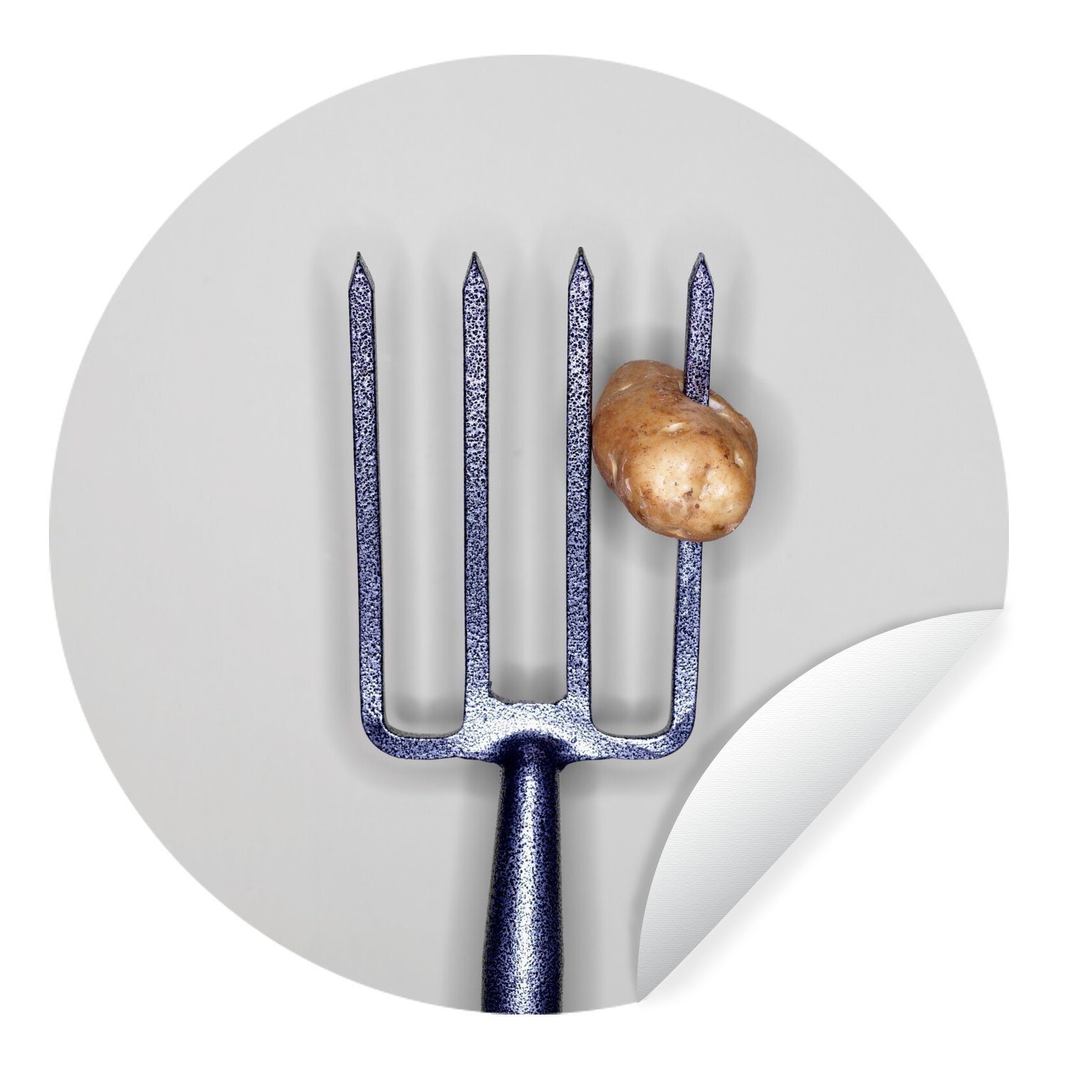 Eine schöne Darstellung einer Mistgabel mit vier Zinken. Der vierte Zacken hält eine durchbohrte Kartoffel.