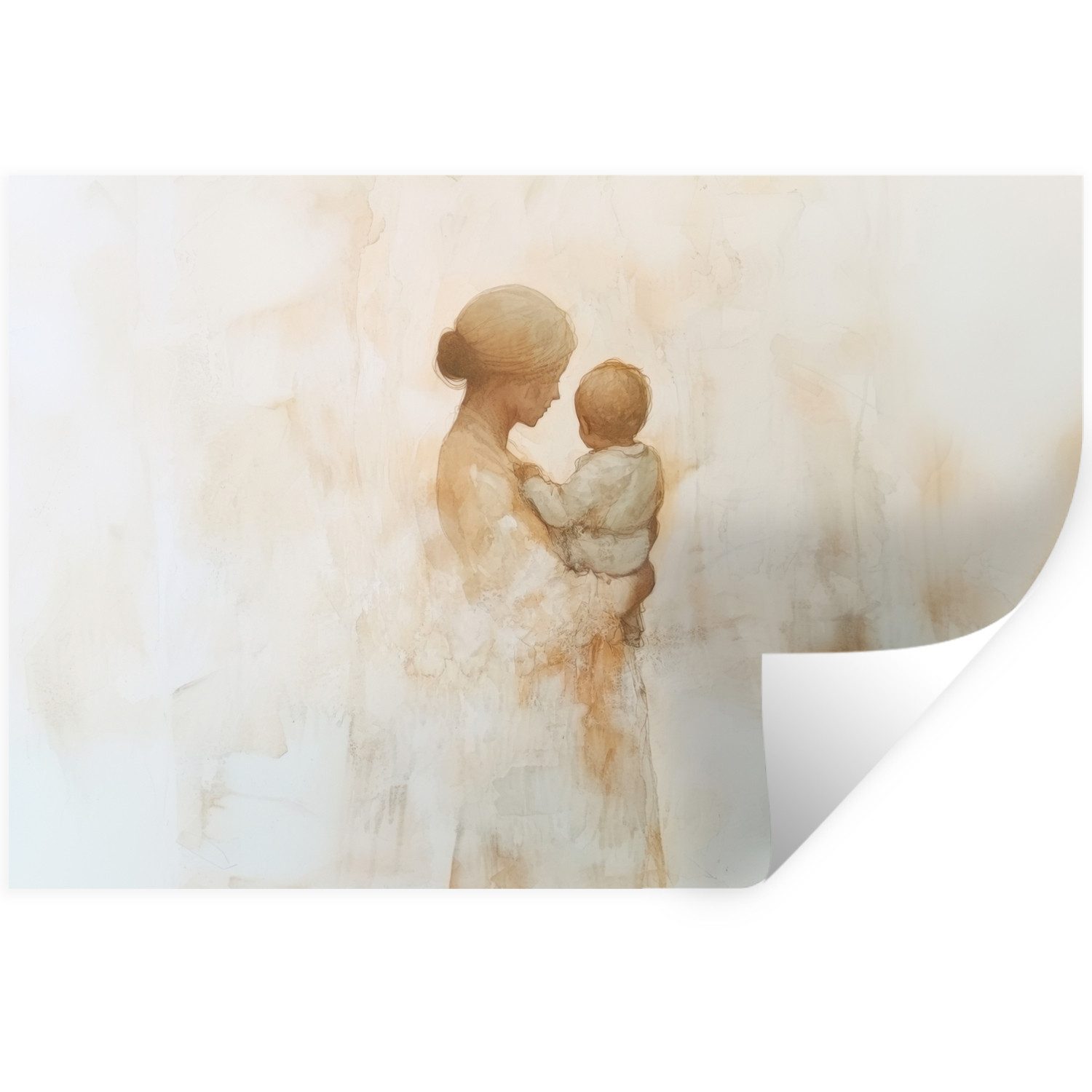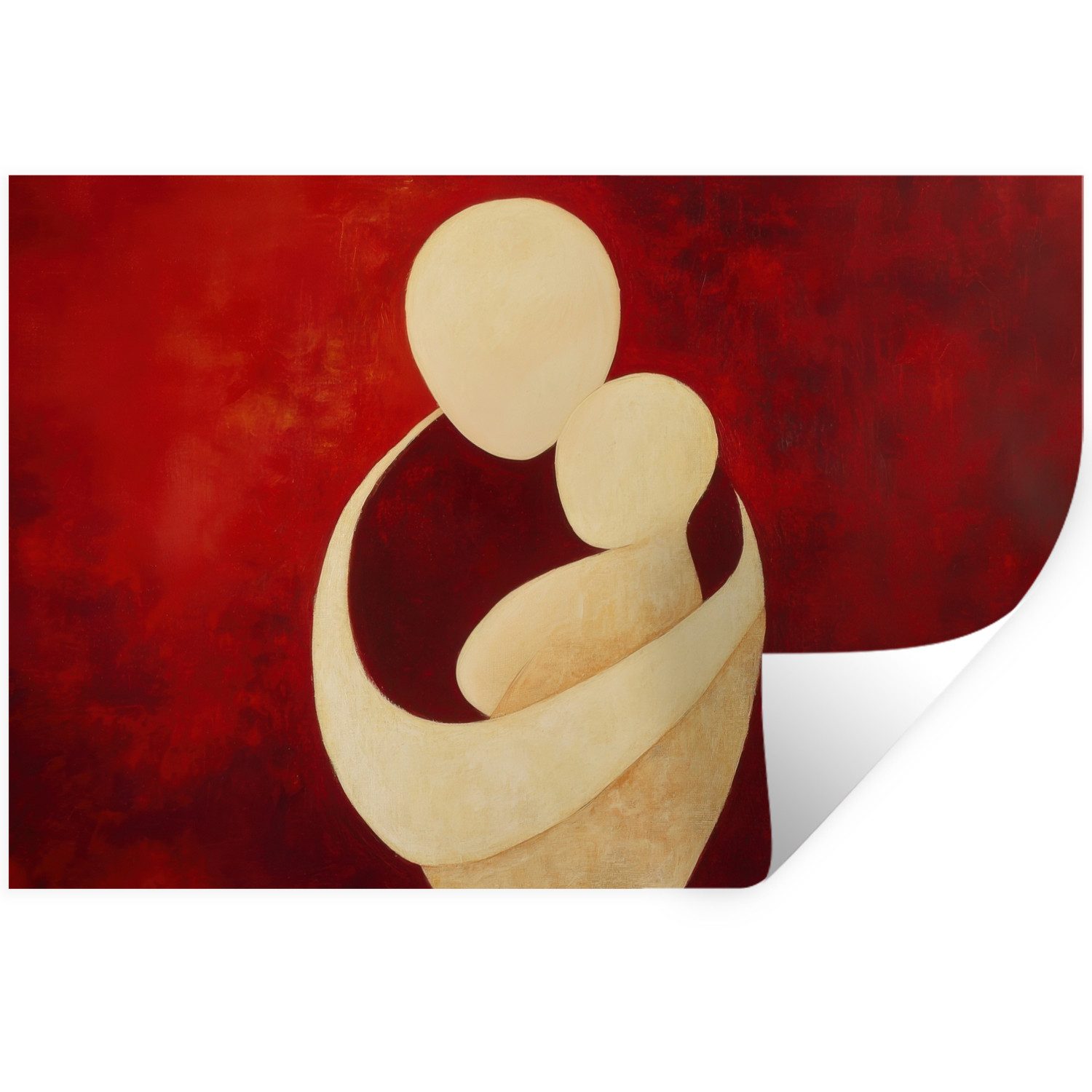 Abstrakte Kunst einer Mutter und eines Kindes in cremefarbenen Formen vor einem tiefroten Hintergrund, der ein Gefühl der Sicherheit vermittelt.