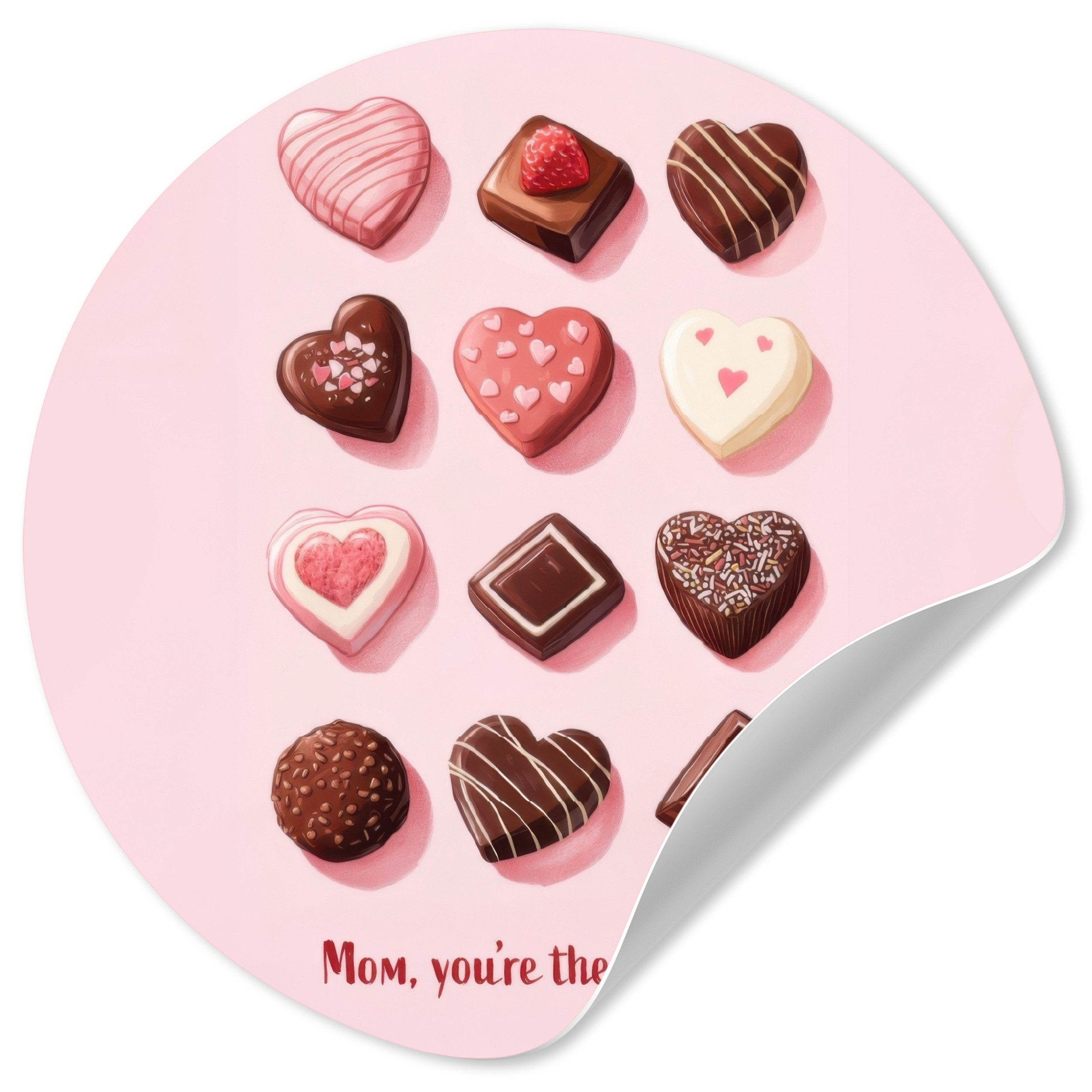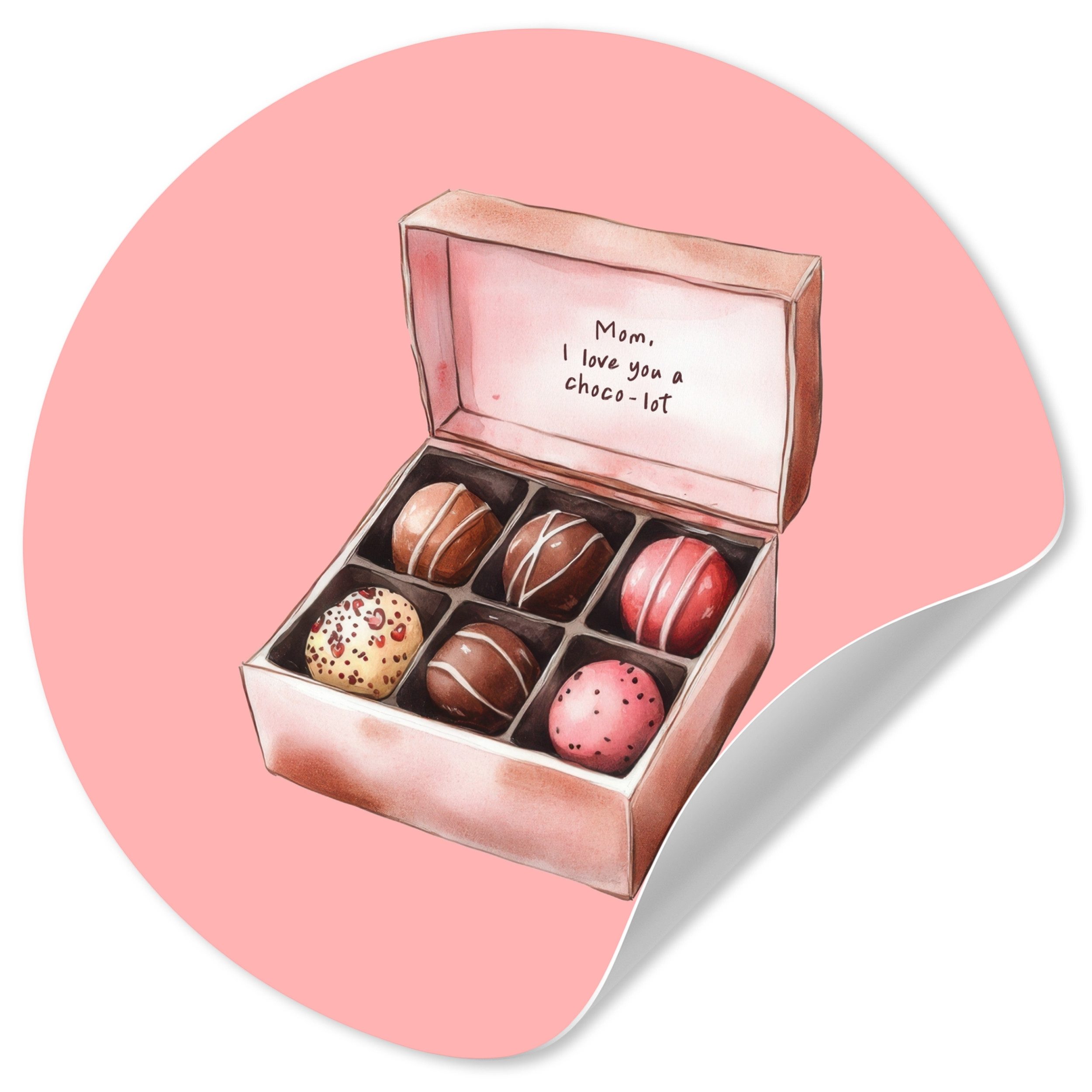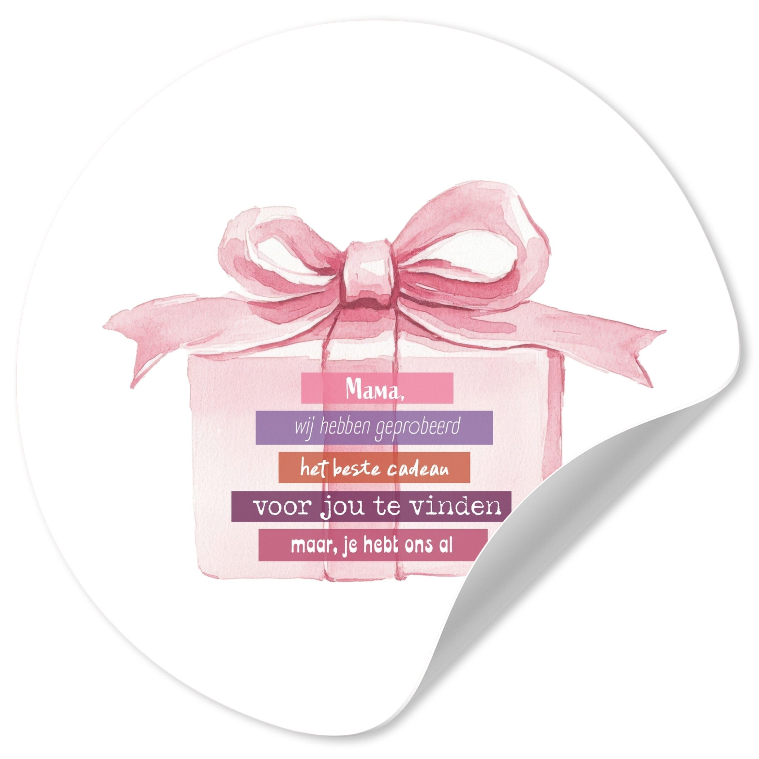 Ein rosa bemaltes Geschenk mit einer großen Schleife und einem süßen Text in verschiedenen Farben: "Mama, wir haben versucht, das beste Geschenk für dich zu finden, aber du hast uns schon."