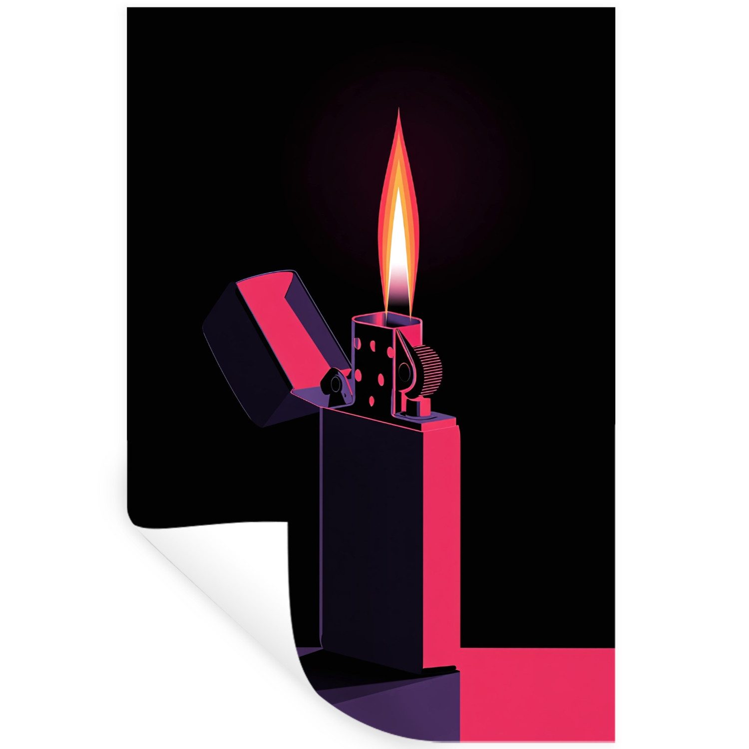 Ein Metallfeuerzeug mit brennender Flamme ist geöffnet. Die Umgebung ist schwarz mit violetten und rosa Reflexen auf der Oberfläche und auf dem Feuerzeug.