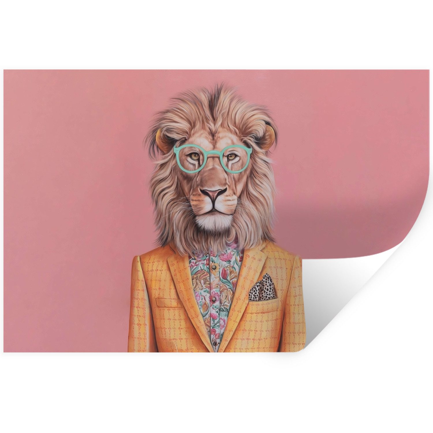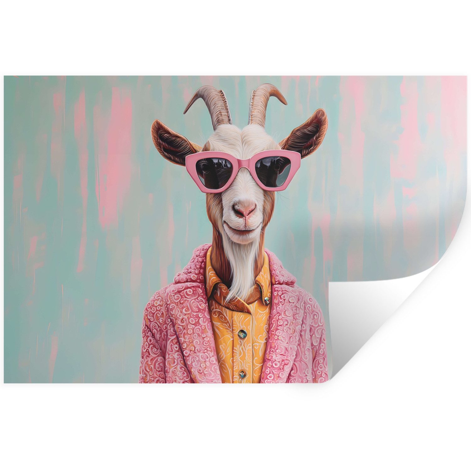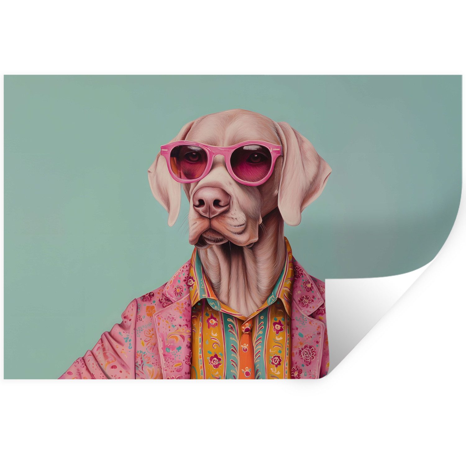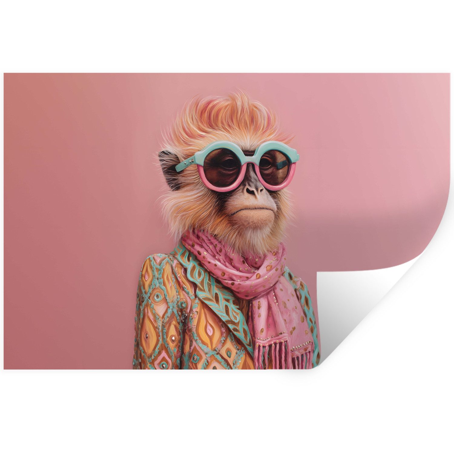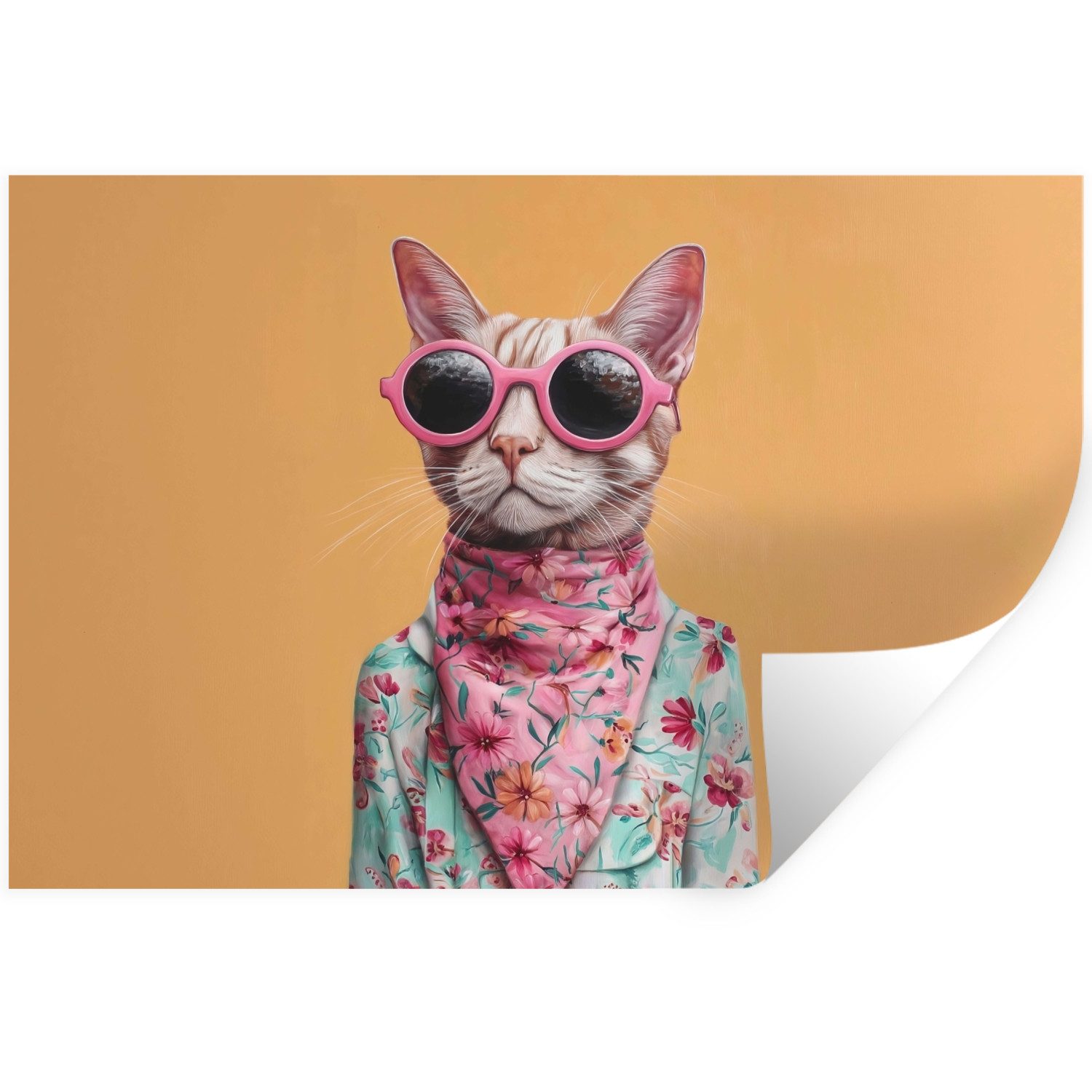Eine Katze mit rosa Sonnenbrille und geblümtem Schal trägt eine mintgrüne Jacke mit rosa Blumen vor einem orangefarbenen Hintergrund.