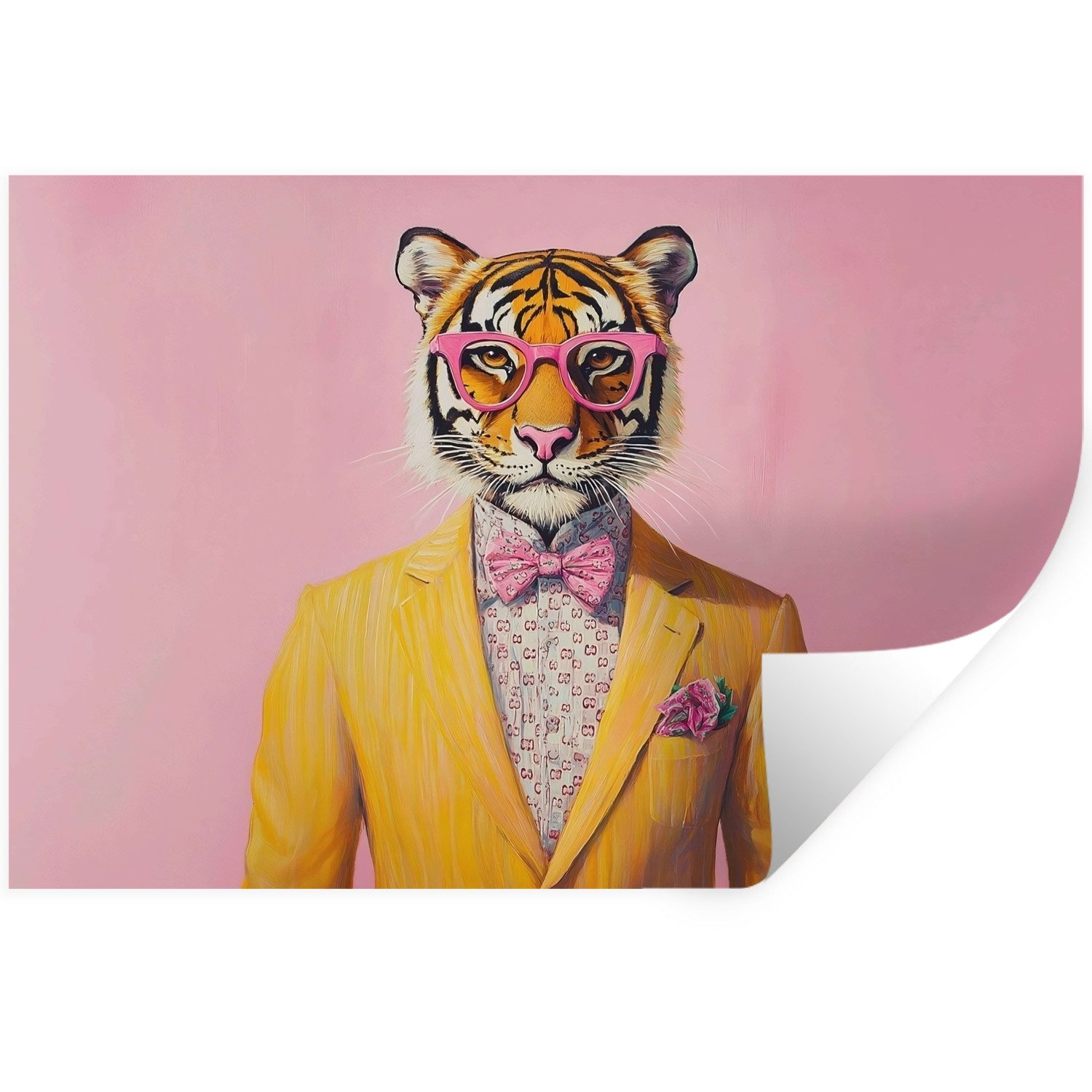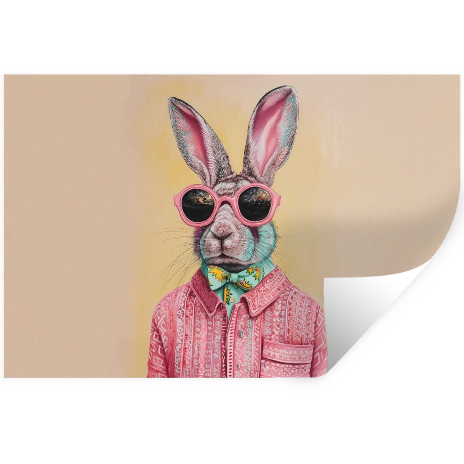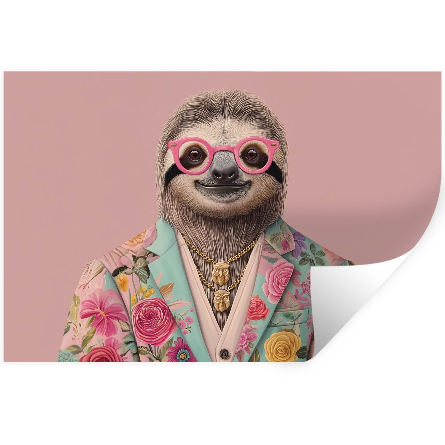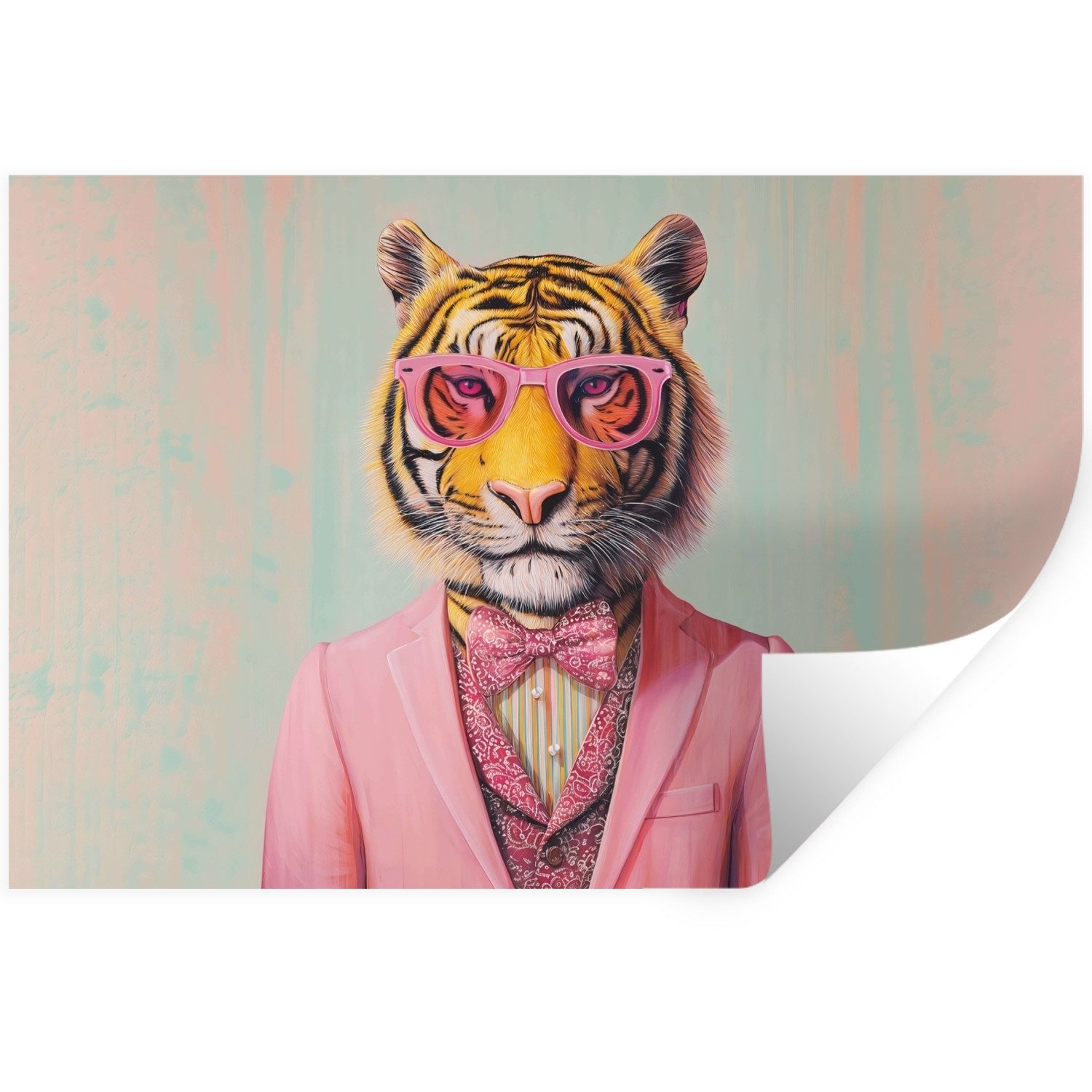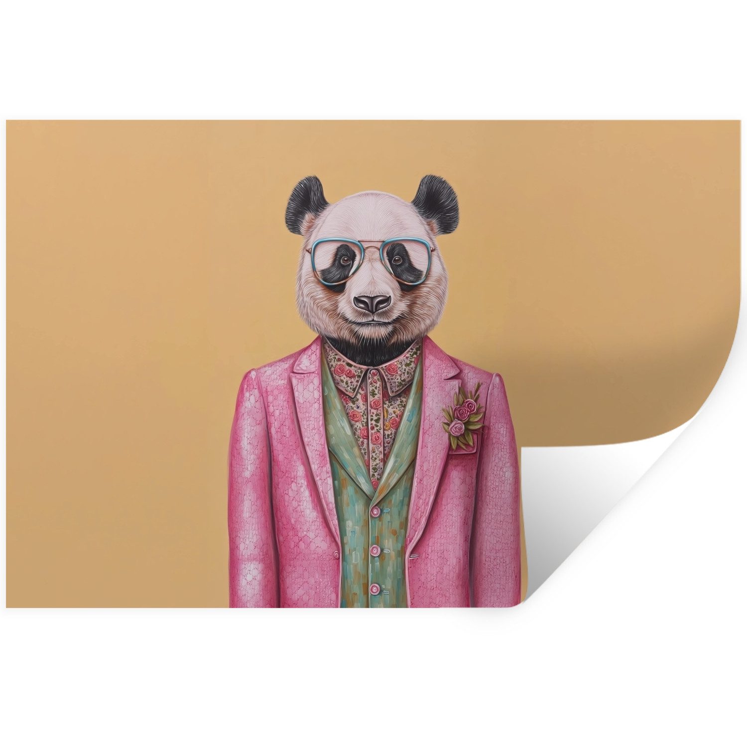 Eine Katze mit rosa Sonnenbrille und geblümtem Schal trägt eine mintgrüne Jacke mit rosa Blumen vor einem orangefarbenen Hintergrund.