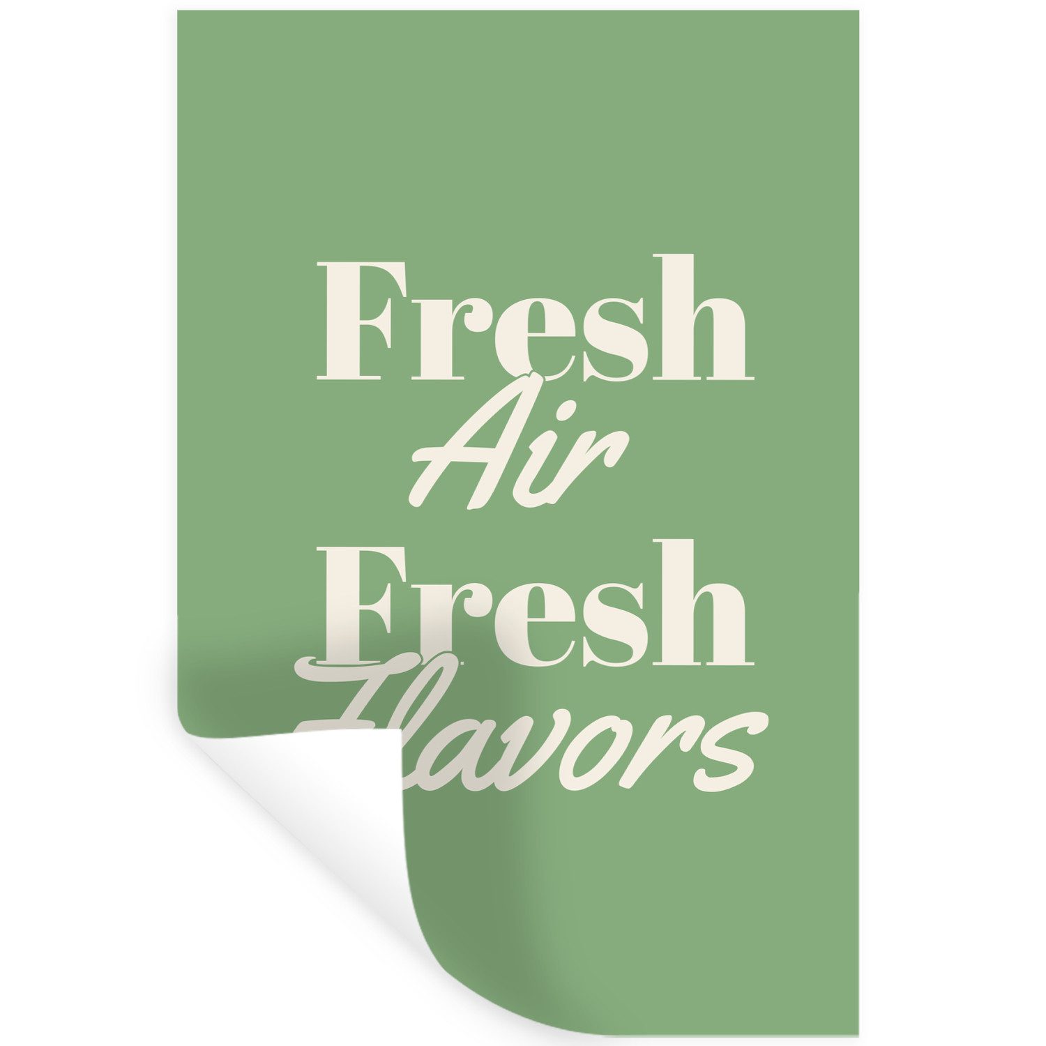 "Fresh Air Fresh Flavors" ist eine Kombination aus Serifenschrift und Handschrift auf grünem Hintergrund. Die sanften Farben und die Typografie strahlen Ruhe und Natur aus.