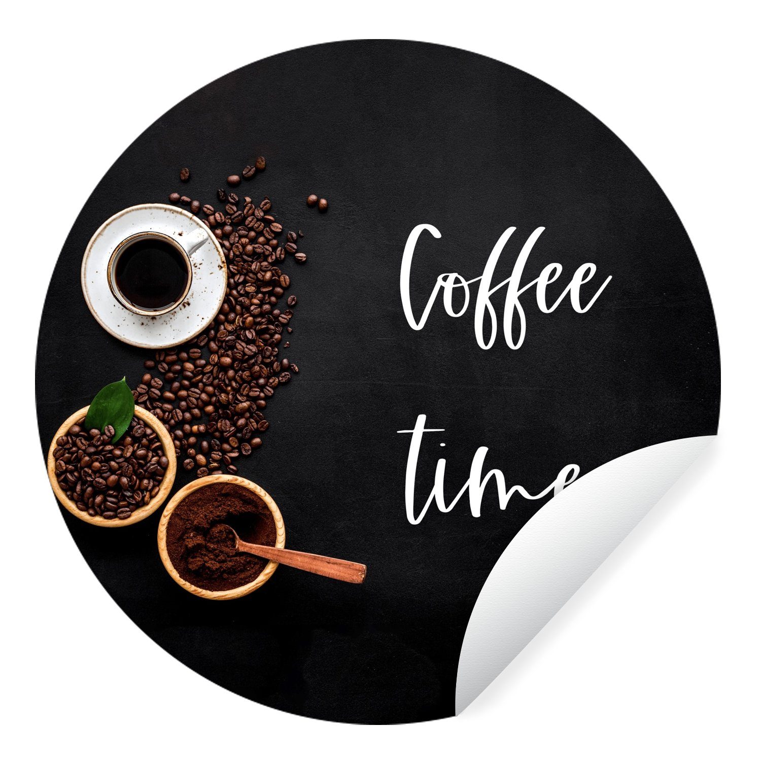 Das Zitat: "Coffee Time" auf einem Hintergrund mit Kaffeeprodukten.