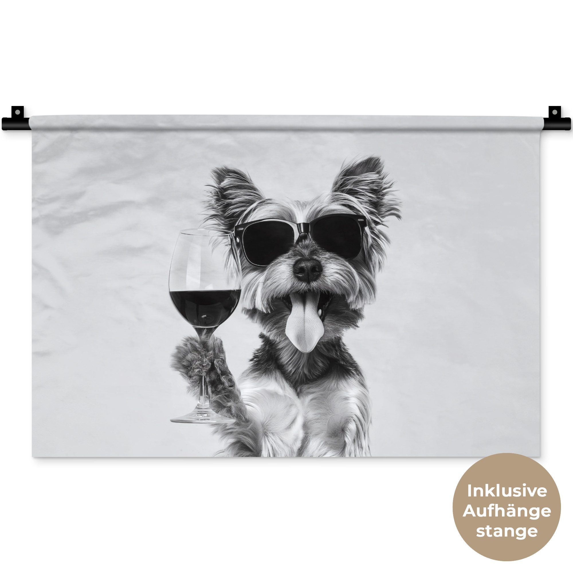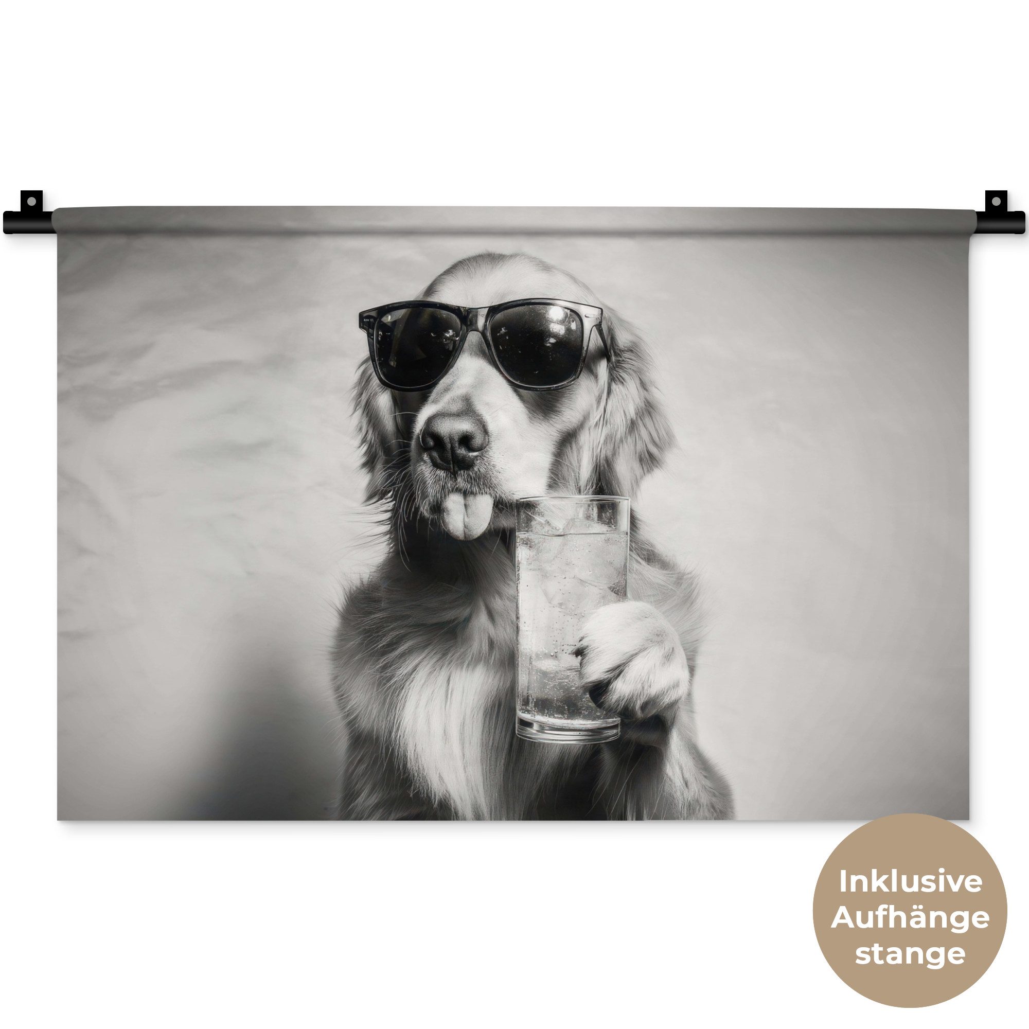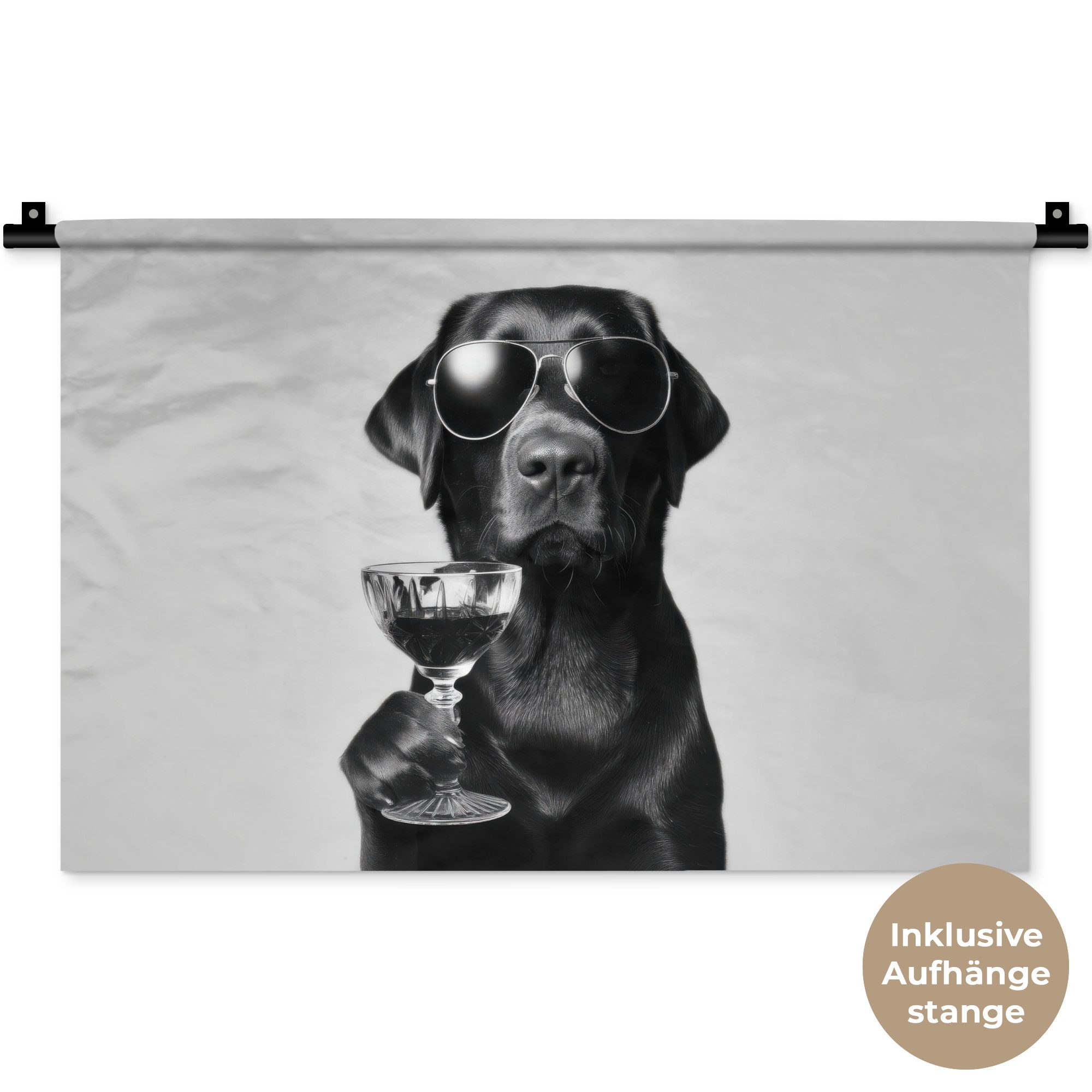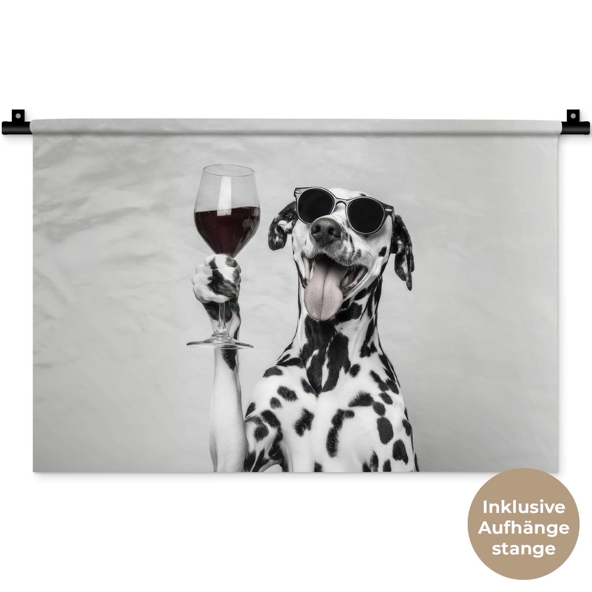 Ein Dalmatiner mit Sonnenbrille und offenem Maul hebt in einer fröhlichen Geste ein Weinglas.