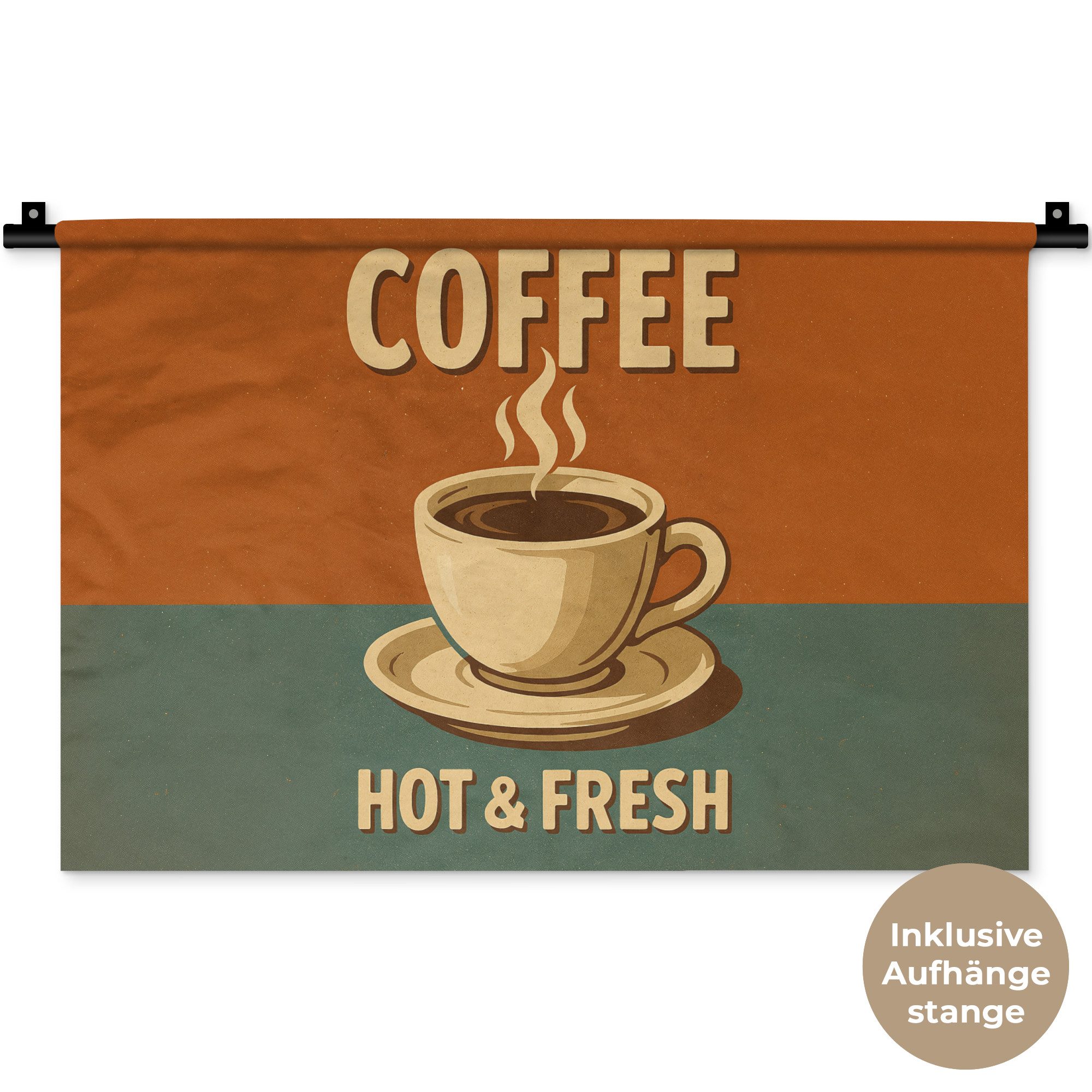 Im Mittelpunkt steht eine dampfende Tasse Kaffee mit dem Schriftzug "HOT & FRESH" darunter, auf einem zweifarbigen orange-blau-grünen Hintergrund im Vintage-Stil.