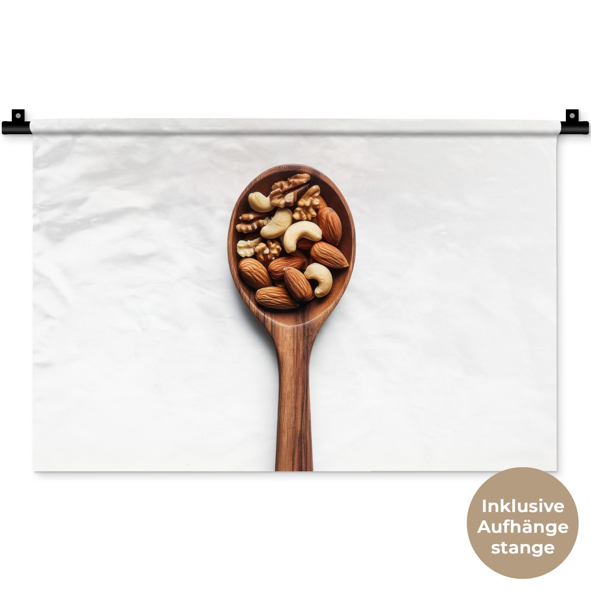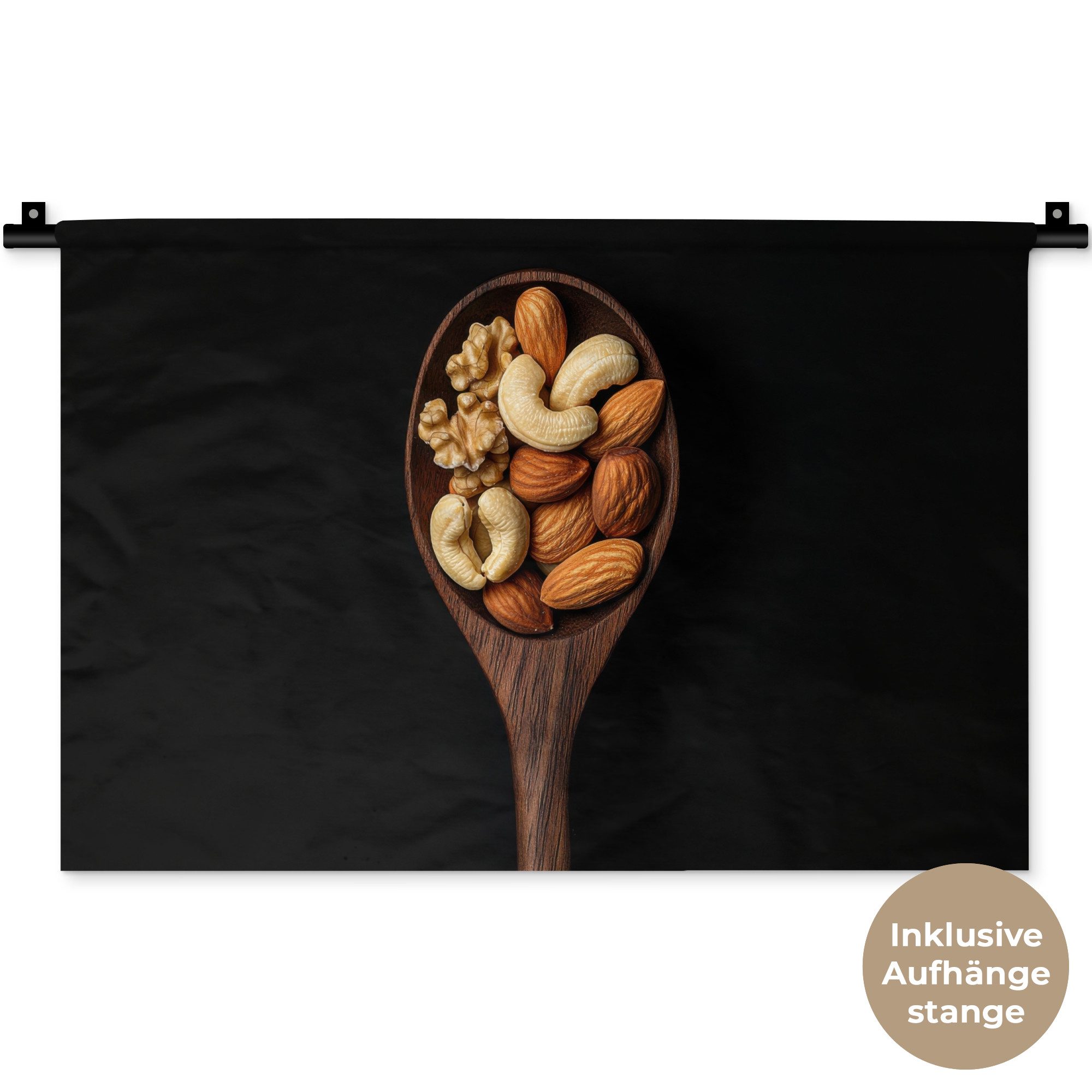 Ein dunkler Holzlöffel, gefüllt mit einer Mischung aus Cashewnüssen, Mandeln und Walnüssen, auf einem schwarzen Hintergrund. Die Nüsse haben warme, erdige Töne, die einen schönen Kontrast zu dem dunklen Löffel und Hintergrund bilden.