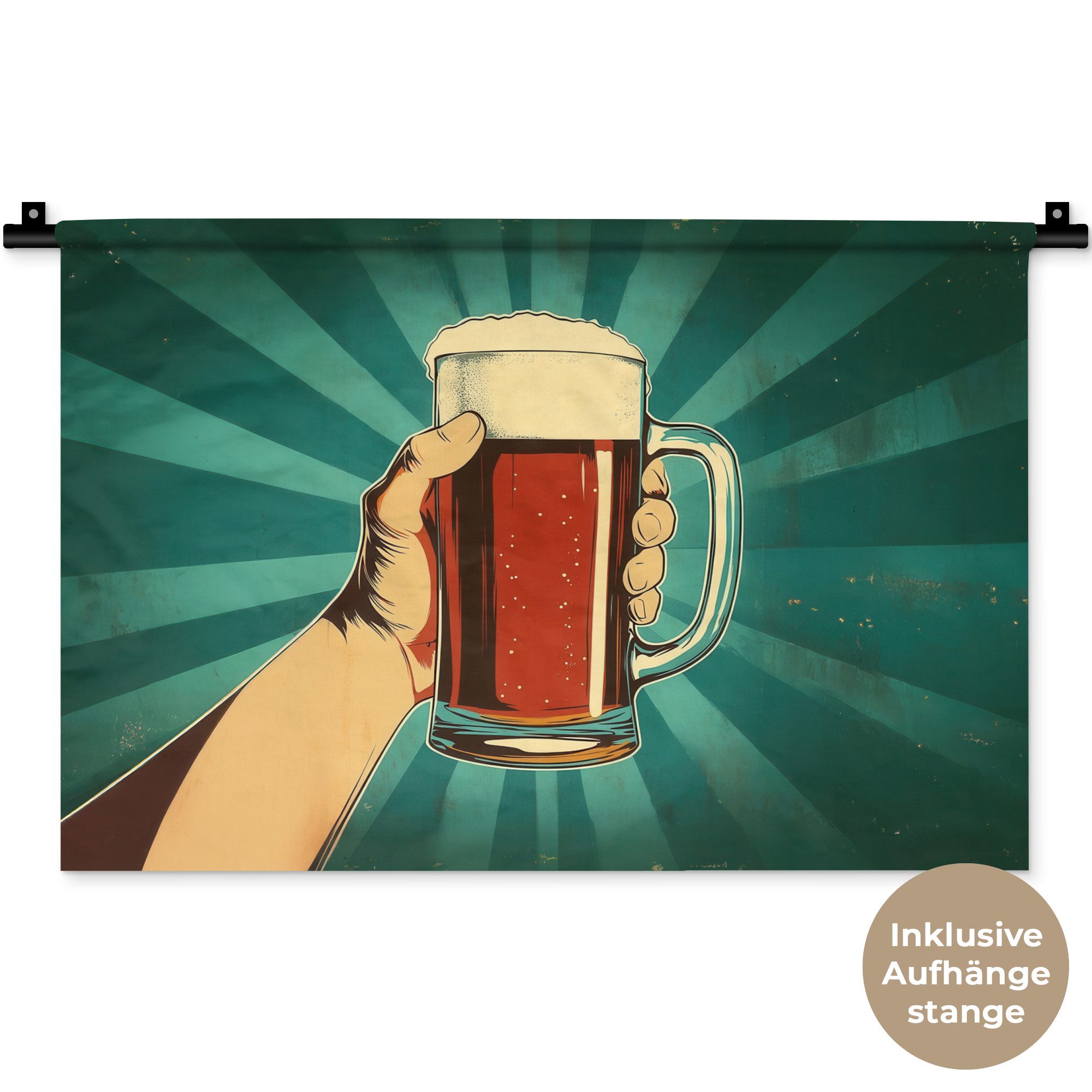 Eine Hand hält einen schäumenden Bierkrug vor einem Hintergrund aus blaugrünen Strahlen hoch, der eine festliche Retro-Atmosphäre hervorruft.