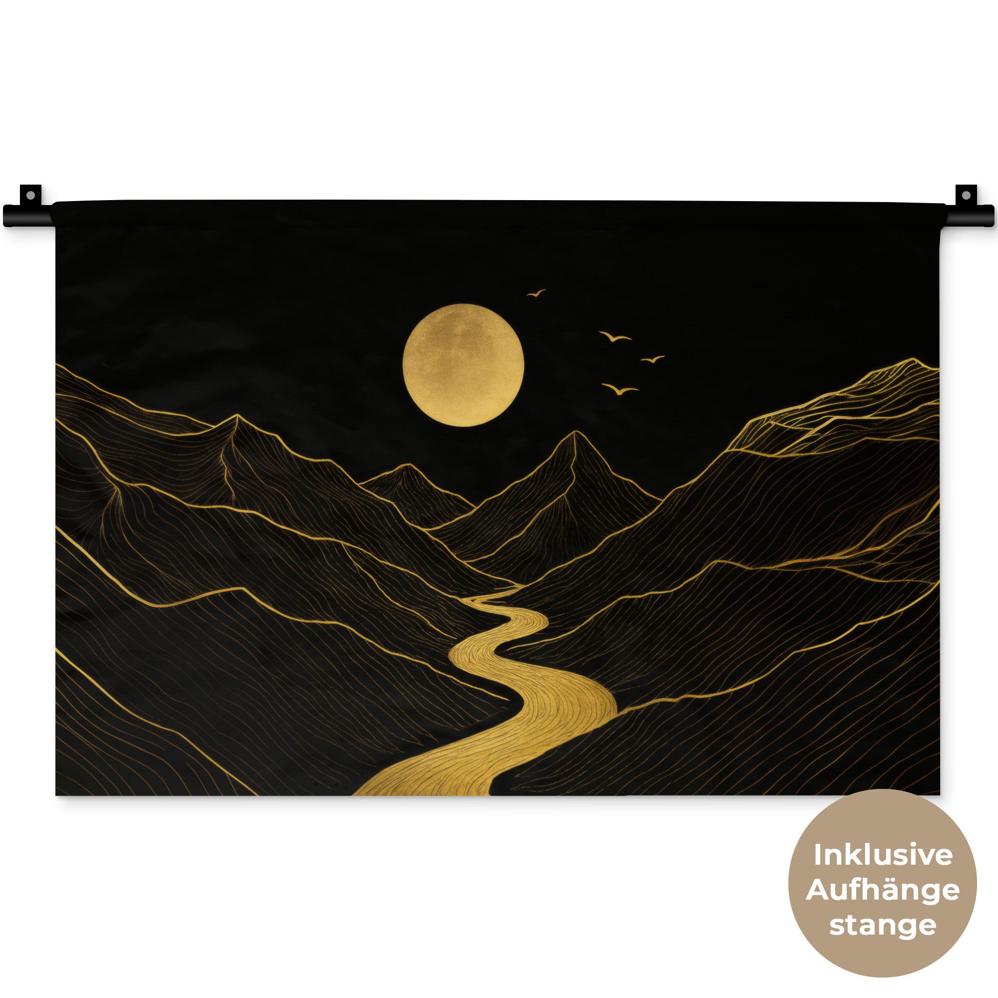 Ein golden schimmernder Fluss schlängelt sich unter einem großen goldenen Mond durch Berge, die von feinen goldenen Linien durchzogen sind.