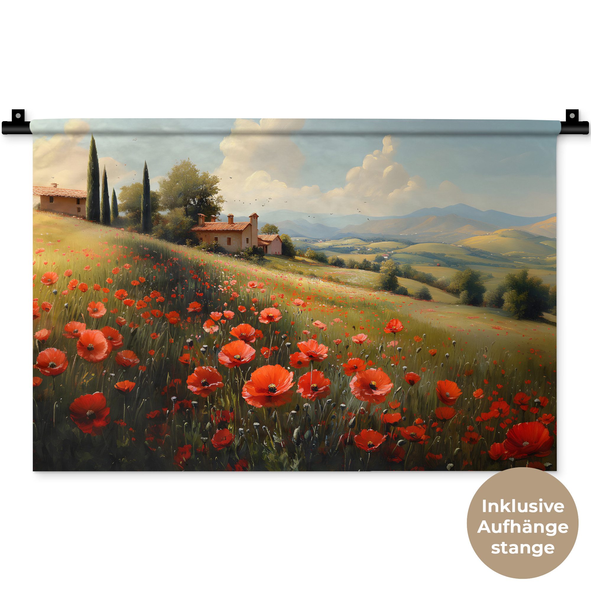 Leuchtend rote Mohnblumen füllen die sanften Hügel vor einem Haus mit Zypressen, mit Bergen und Wolken im Hintergrund.
