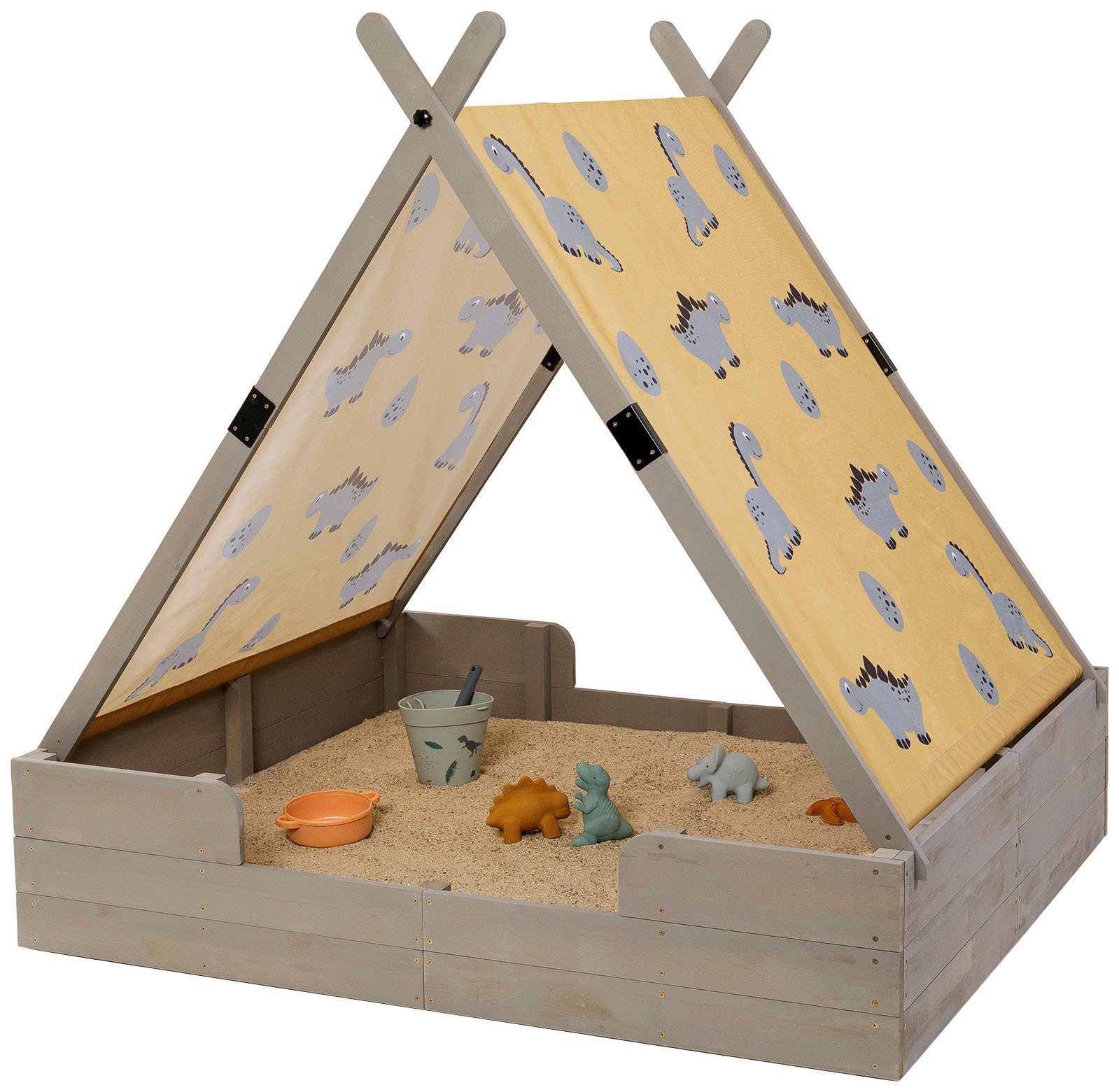 Lieferumfang | Holzschutz vorbehandelt, Lieferumfang ohne Dekoration, Stoffzelt ist einfach abnehmbar & zusammenklappbar, Stoffzelt kann separat genutzt werden, Stoffzelt ockerfarben, aus Polyester mit modernem Dino Print, aus massivem Zypressenholz gefertigt, einfacher Ein- & Ausstieg, hochwertiger Sandkasten inklusive Zelt, inkl. Abdeckplane aus PP, inkl. Sandkastenvlies |