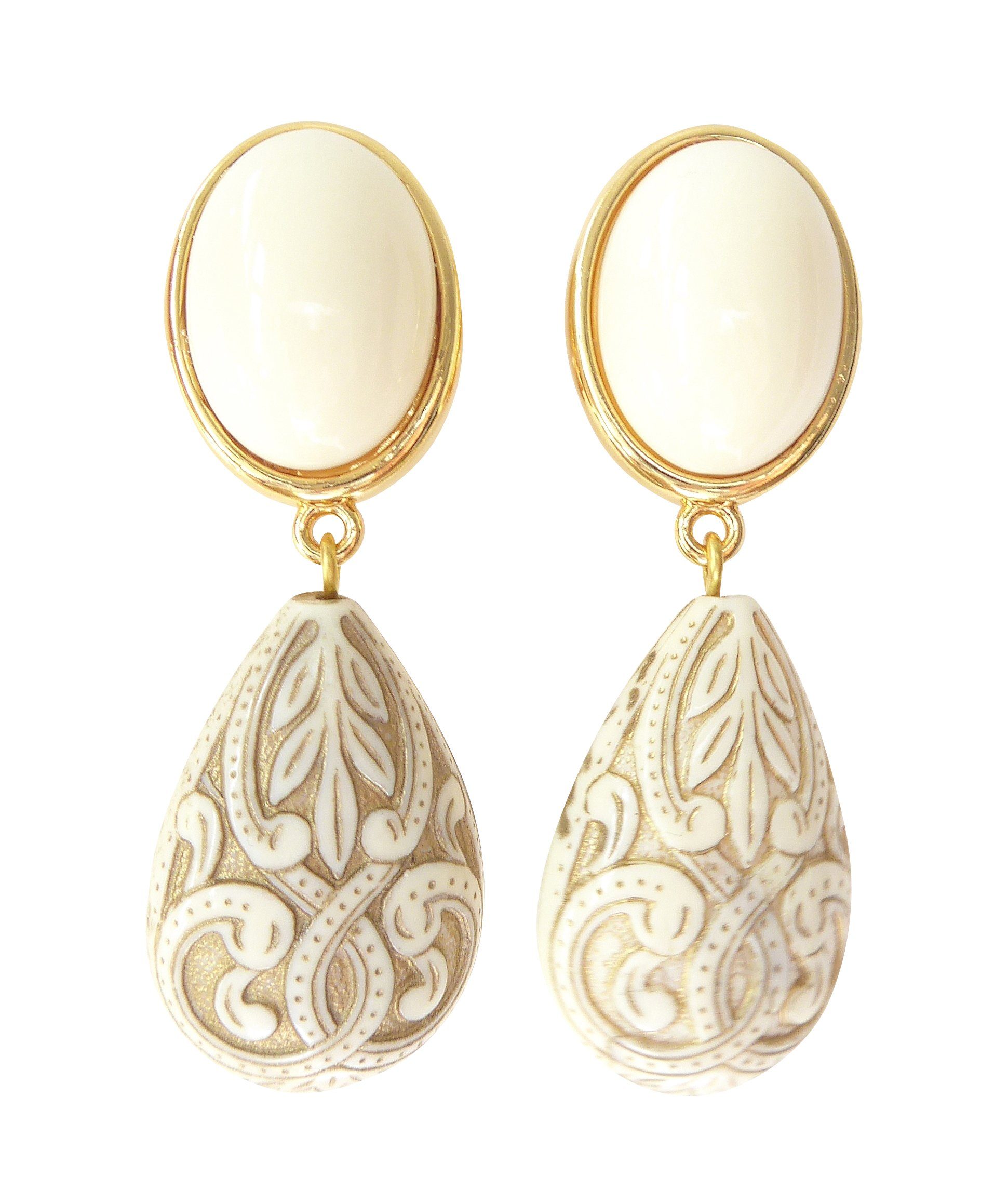 Ausgefallene Clips von JustWin mit einem ovalen Stein in einem hellen beige und mit einem tropfenförmigen beigen Anhänger, der mit Ornamenten verziert ist. Der Stein und der Anhänger bestehen aus Acryl, so dass die Ohrringe extrem leicht sind. Bei dem Material der Ohrringe handelt es sich um eine antiallergische Metalllegierung mit einer Gelbvergoldung. Durch ihre Розмір wirken die Ohrringe besonders eindrucksvoll! Hinter dem Label „JustWin“ stehen die beiden Designer Kurt Justmann und Paul Winter, die Schmuck für Frauen entwerfen, die voluminöse Designs lieben. Die extravaganten, handgearbeiteten Kreationen spielen mit auffälligen Farben, Formen und Oberflächen. Der ins Auge fallende Modeschmuck ist bereits auf der Titelseite der deutschen VOGUE zu bewundern gewesen und erscheint regelmäßig in der Presse. Liebhaberinnen von Statement-Stücken werden bei JustWin nicht widerstehen können! Maße der Ohrringe: Höhe: 5,0 cm, Breite: 2,0 cm.