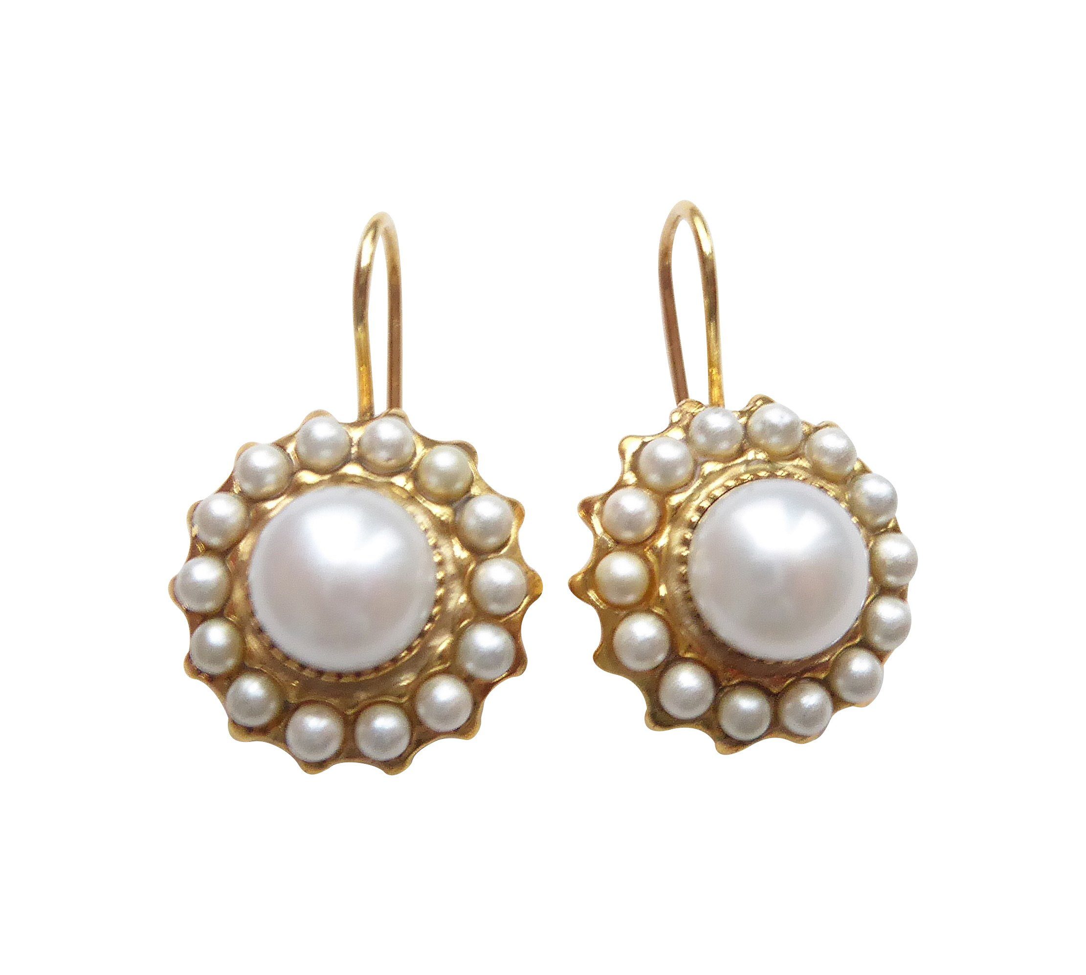 Perlenohrringe dürfen in keiner Schmuckschatulle fehlen: Antik wirkende Ohrhänger mit einer weißen Süßwasser-Perle in der Mitte und einem Kranz von kleinen Perlen. Das Material dieser hochwertigen Ohrhänger besteht aus einer vergoldeten Legierung aus Silber und Kupfer, ist antiallergisch und gut verträglich. Besonders schicke und dekorative Perlenohrhänger passend zu vielen Gelegenheiten! Diese edlen, eleganten Vintage-Ohrringe werden in Florenz in einer kleinen Schmuck-Werkstatt in liebevoller und aufwendiger Handarbeit gefertigt, so dass jedes dieser außergewöhnlichen Schmuckstücke ein einzigartiges Unikat ist. Daher sind kleine Abweichungen zu dem Bild möglich. Die hübschen und hochwertigen Ohrringe sind inspiriert durch historischen, klassischen Schmuck von Renaissance-Gemälden aus den Uffizien. Es liegt ganz im Trend, dass Ohrringe auf alt gemacht werden und antik und nostalgisch wirken. Ein Muss für Liebhaberinnen von Ohrringen aus Italien! Durch ihr zeitlos schönes Design im Antik-Look bzw. Retro-Look sind sie besonders geeignet als wunderschönes Geschenk zum Geburtstag, Weihnachten, Konfirmation oder Valentinstag für Frauen oder Mädchen mit Stil und Anspruch. Ein passendes und perfektes Accessoire für verschiedene Anlässe wie beispielsweise ein Fest oder Ball, eine Hochzeit oder Party - aber auch ein stilvoller Begleiter für Alltag, Büro, Business und Freizeit. Ein wunderbares Glanzstück am Ohr und ein toll kombinierbares Highlight für viele Outfits! Maße der Ohrringe: Höhe (ohne Gehänge): 1,8 cm, Breite: 1,8 cm.