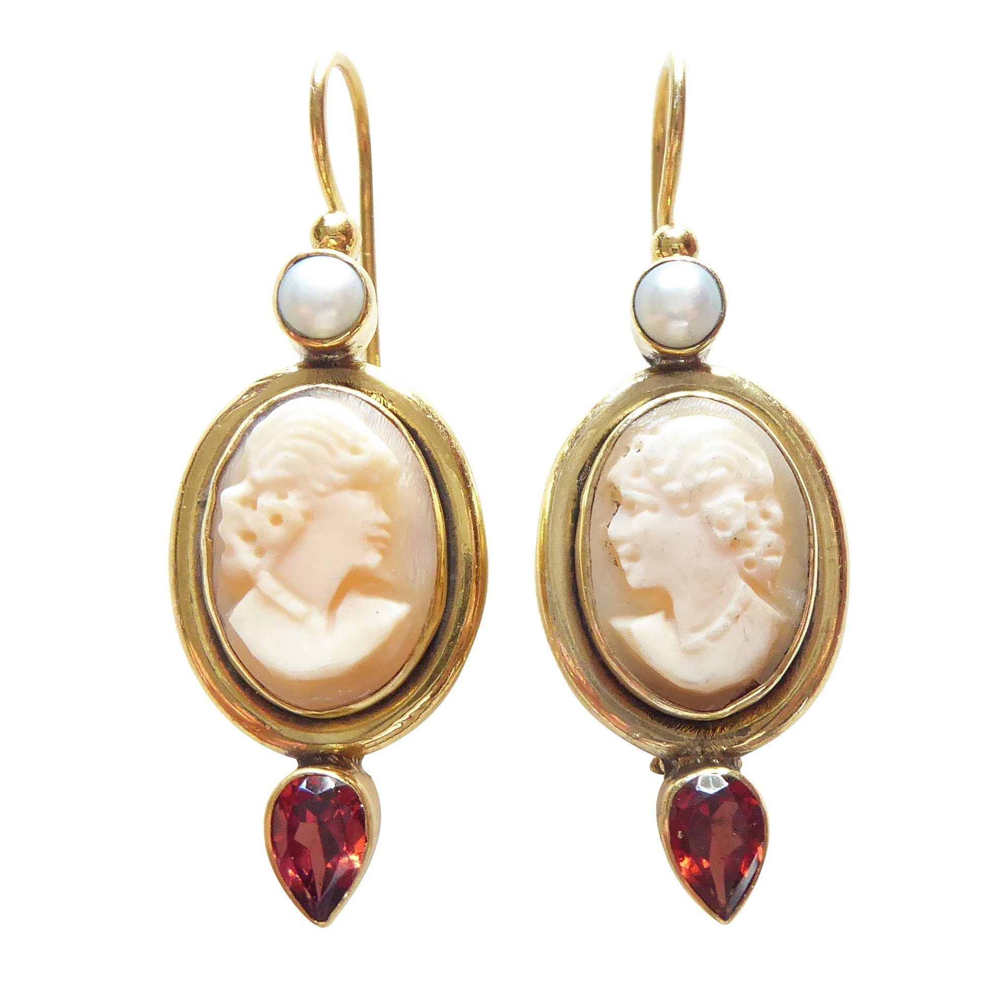 Ausgefallene, relativ große Gemmenohrringe (Silber vergoldet), die jeweils mit einer Süßwasserperle und einem kleinen Granat verziert sind. Ganz besondere Ohrringe für Liebhaberinnen von altmodischem Gemmenschmuck! Diese stilvollen, zeitlosen Ohrringe werden in Florenz hergestellt. Sie werden in einer kleinen Schmuckwerkstatt in aufwendiger Handarbeit gefertigt, so dass jedes Schmuckstück ein einzigartiges Unikat ist. Daher sind kleine Abweichungen zu dem Bild möglich. Als Vorbild für diese exklusiven Ohrringe dienen Schmuckstücke von Renaissance-Gemälden aus den Uffizien. Maße der Ohrringe: Höhe (ohne Gehänge): 3,1 cm, Breite: 1,5 cm.