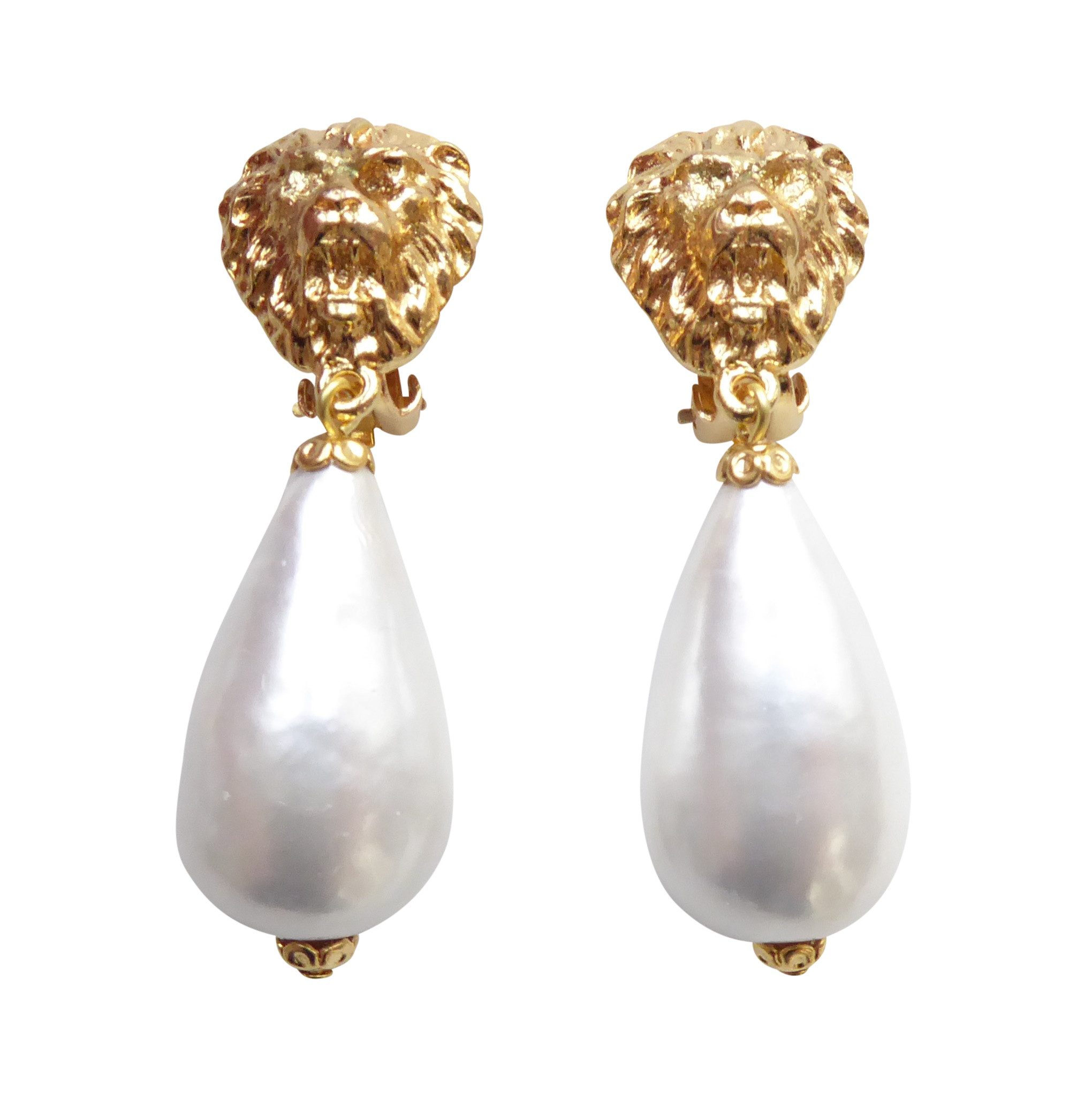 Besonders auffällige Clip-Ohrstecker (für Ohrlöcher) von JustWin mit einem vergoldeten Löwen-Kopf und mit einem tropfenförmigen Perlenanhänger aus lackiertem Pappmaché. Die Ohrringe sind extrem leicht und angenehm zu tragen. Bei dem Material der schönen Statement-Ohrringe handelt es sich um eine Metalllegierung mit einer Gelbvergoldung. Das Material ist antiallergen und sehr gut verträglich. Durch ihre Розмір wirken die stylischen, hübschen Ohrstecker besonders eindrucksvoll und sind ein absoluter Hingucker! Hinter dem Label „JustWin“ stehen die beiden Designer Kurt Justmann und Paul Winter, die modischen, glamourösen Statement-Schmuck für Frauen entwerfen, die voluminöse und bunte Designs lieben. Die extravaganten, handgearbeiteten Kreationen sind ein eleganter Blickfang und spielen mit auffälligen, fröhlichen Farben, Formen und Oberflächen. Der hochwertige, stilvolle Modeschmuck ist bereits auf der Titelseite der deutschen VOGUE zu bewundern gewesen und erscheint regelmäßig in der Presse. Liebhaberinnen von Statement-Ohrringen in vielen verschiedenen Trend-Farben werden bei JustWin nicht widerstehen können! Moderner, edler und individueller Mode-Stil für jedes Outfit. Die schicken und gleichzeitig auch klassischen Designer-Ohrringe werten jeden Look auf, egal bei welcher Gelegenheit: ob im Büro, in der Freizeit, im Urlaub oder bei einem festlichen Anlass wie einer Feier, Party, Ball, Hochzeit, Konfirmation, Oktoberfest etc. Sie werden gerne zusammen mit einem Dirndl als ausgefallenes Trachten-Schmuckstück getragen. Dieser tolle Bestseller ist auch ein wunderbares Geschenk zum Geburtstag, Weihnachten, Hochzeitstag, Valentinstag oder dergleichen und ein besonderes Must-Have für Frauen und Mädchen. Maße der Ohrringe: Höhe: 4,7 cm, Breite: 1,5 cm.