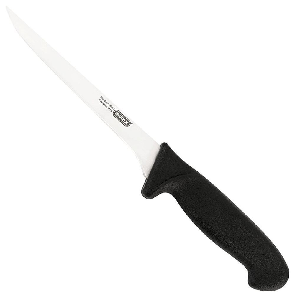 MULEX Filiermesser – Semi-flexibel für präzises Arbeiten mit Fleisch & Fisch Das MULEX Filiermesser mit semi-flexibler Klinge wurde speziell für feine Schneidarbeiten entwickelt und ermöglicht präzises Filetieren von Fisch und Fleisch. Dank der schmalen, leicht flexiblen Klinge passt sich das Messer optimal an die Struktur des Schneidguts an – ideal für exakte Schnitte bei empfindlichen Lebensmitteln. Ob Fisch filetieren, entgräten oder von der Haut befreien – mit diesem Messer gelingt jede Aufgabe sauber und effizient. Auch Fleisch lässt sich mühelos zuschneiden: Schmetterlingsschnitte, das Entfernen von Sehnen oder Knorpeln sind im Handumdrehen erledigt. Der ergonomische Griff liegt angenehm und sicher in der Hand und sorgt für eine stabile Führung. Die ausgewogene Balance zwischen Klinge und Griff garantiert präzises Arbeiten auch über längere Zeit hinweg. Gefertigt aus rostfreiem, deutschem Molybdän-Vanadium-Stahl, bietet die Klinge eine hohe Schnitthaltigkeit, Korrosionsbeständigkeit und Langlebigkeit. Bitte nach jedem Gebrauch unter fließendem, lauwarmem Wasser mit einem weichen Schwamm oder Tuch reinigen und sorgfältig abtrocknen. So bleibt das Messer dauerhaft scharf und langlebig.
