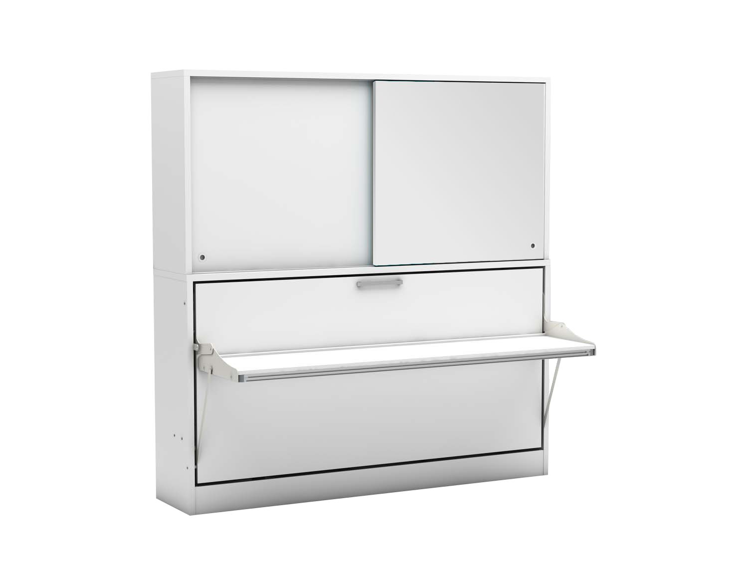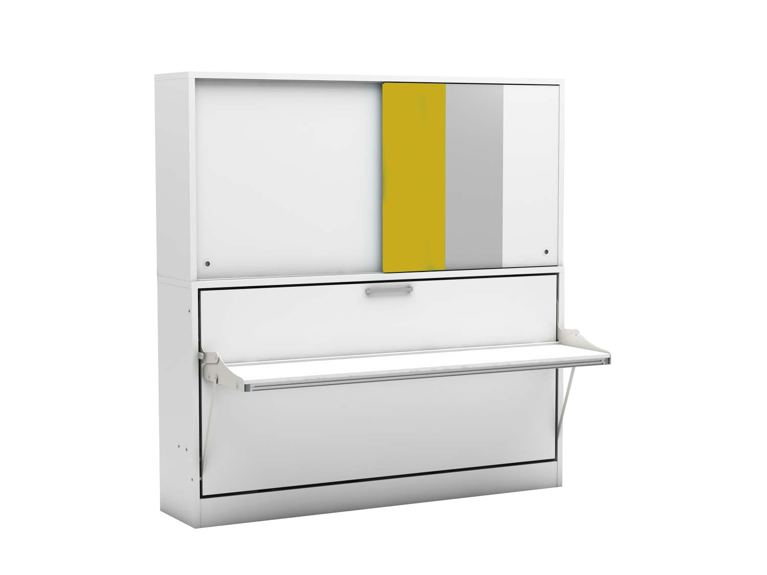 ACADEMY ist ein multifunktionales Möbelstück mit einem Schiebetürenschrank, einem Querklappbett und einem Schreibtisch. Dank einem speziellen Mechanismus, bleibt der Tisch immer parallel zum Boden. Всіs, was auf dem Tisch steht, muss beim Aufklappen des Bettes nicht weggeräumt werden.