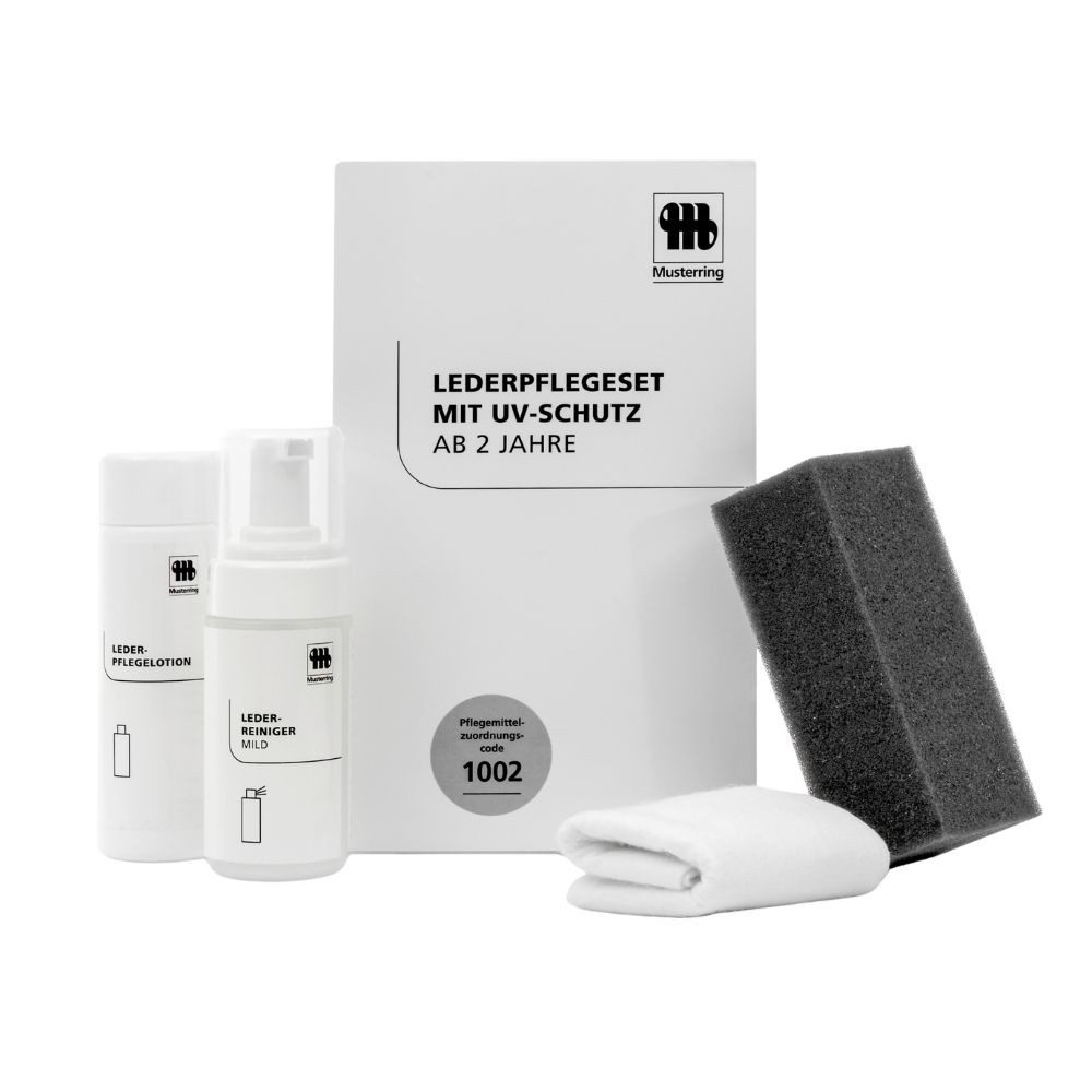 1x Lederreiniger mild (125 ml) mit Schaumspender 1x Reinigungsschwamm für schonende Anwendung 1x Lederpflegelotion (150 ml) mit UV-Filter 1x Pflegetuch für gleichmäßigen Auftrag