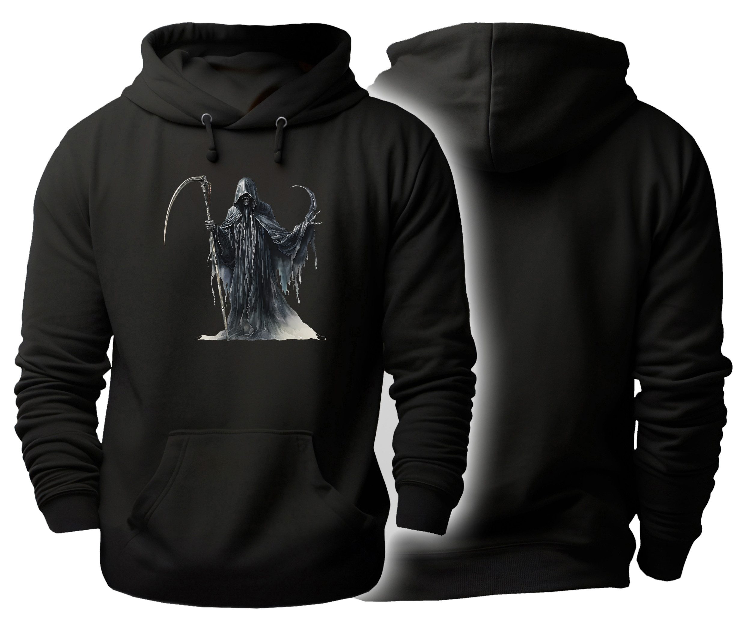 Ein Hoodie für alle, die den Nervenkitzel lieben: Unser „Grim Reaper“-Kapuzenpullover zieht mit seinem detailreichen Brustprint sofort alle Blicke auf sich. Das Motiv zeigt den Sensenmann in voller, schaurig-schöner Pracht – tiefschwarzer Umhang, bedrohliche Sense, ein geheimnisvolles Spiel aus Licht und Schatten. Genau das Richtige für alle, die ein Faible für düstere Ästhetik haben und gleichzeitig Wert auf ein stylisches Statement-Piece legen. Ob beim Chillen zu Hause, beim nächtlichen Stadtbummel oder auf dem nächsten Rock- oder Metal-Festival – dieser Hoodie bringt dich modisch auf die dunkle Seite der Macht, ganz ohne dass du deine Seele verkaufen musst. Die hochwertige Druckqualität sorgt dafür, dass der furchteinflößende Look selbst nach vielen Wäschen intensiv bleibt, während die weiche, atmungsaktive Innenseite für maximalen Tragekomfort sorgt. Mit diesem Kapuzenpullover setzt du ein klares Zeichen: Dein Style ist rebellisch, dein Humor leicht schwarz gefärbt, und du bist immer bereit für ein modisches Abenteuer. Ob als Geschenk für echte Gothic-Fans, Metalheads oder einfach für dich selbst – dieser Hoodie ist mehr als nur ein Kleidungsstück, er ist ein Statement.