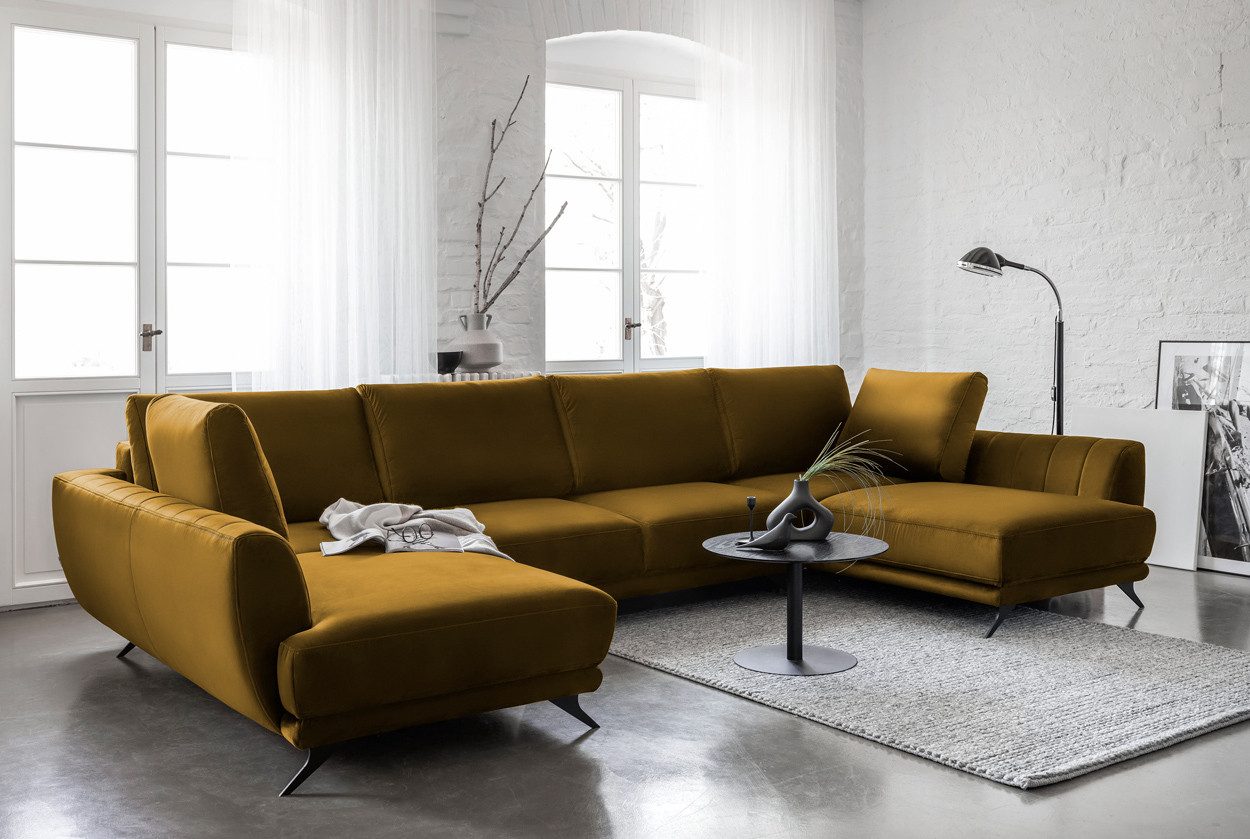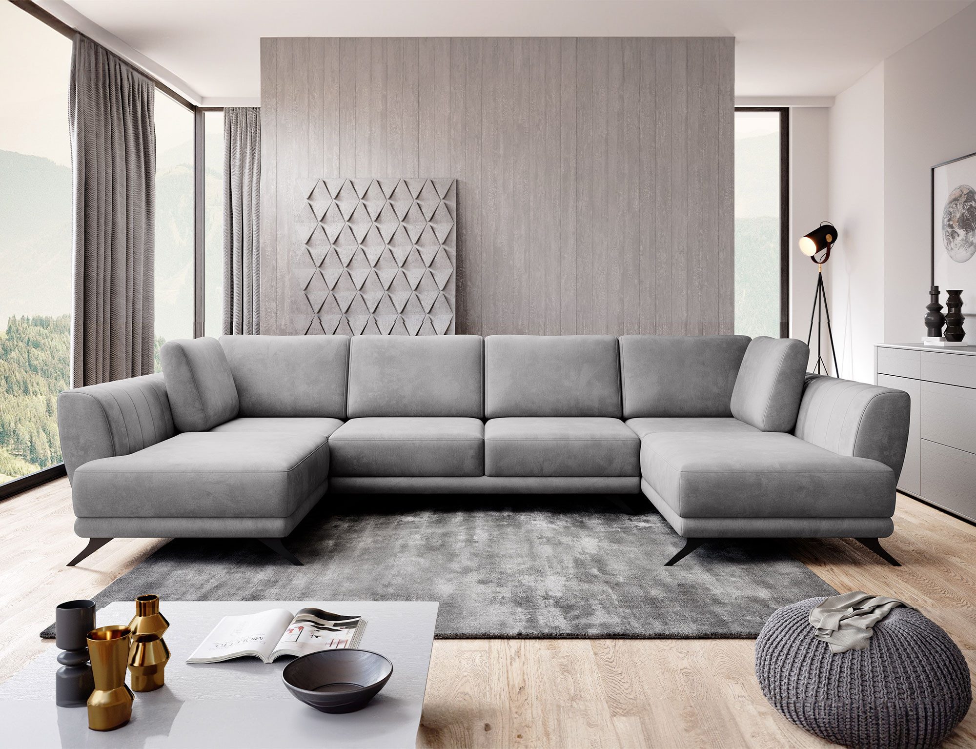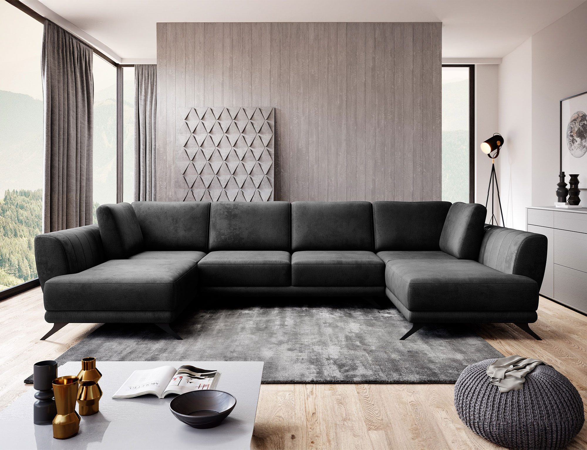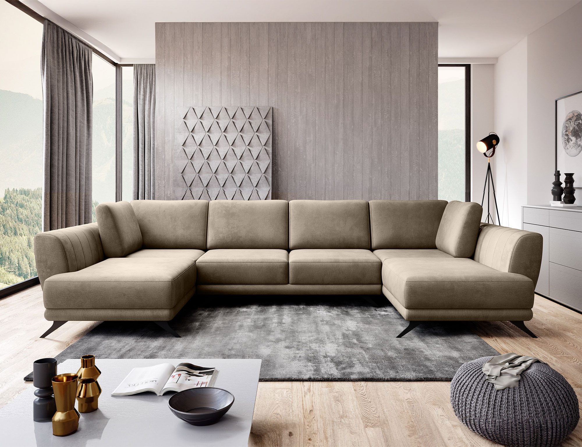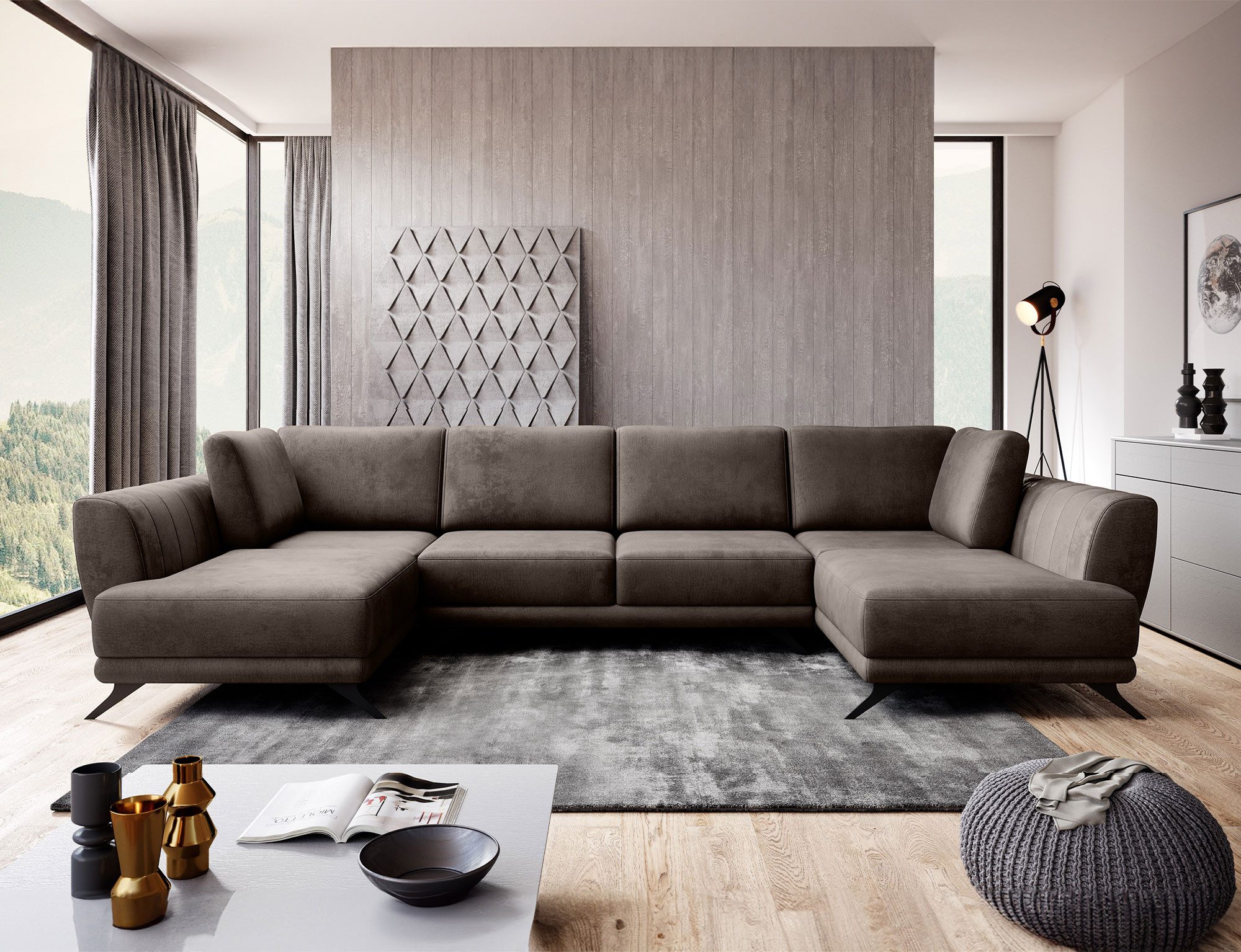 Die Wohnlandschaft Larco in U-Form verbindet modernes Design mit maximalem Komfort und durchdachter Funktion. Mit einer Gesamtbreite von 362 cm bietet sie großzügig Platz für Familie und Gäste.